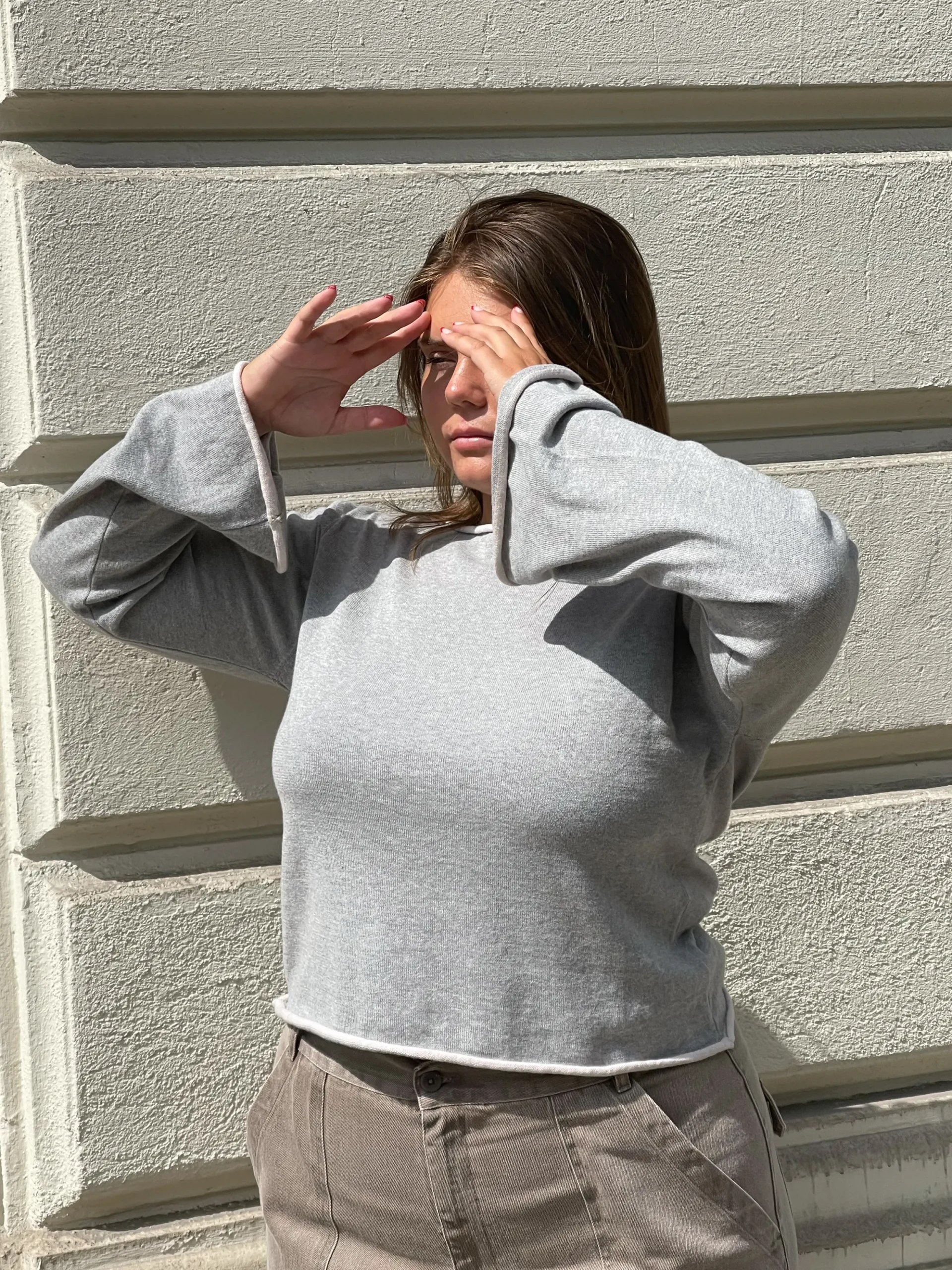Our Bateau Neck Sweater features two tones, a darker main shade with a contrast lighter shade at the edges. It is knitted in a 50/50 blend of recycled and Egyptian cotton fibers and has a classic boat neck as well as wide sleeves that give it a beautiful silhouette.