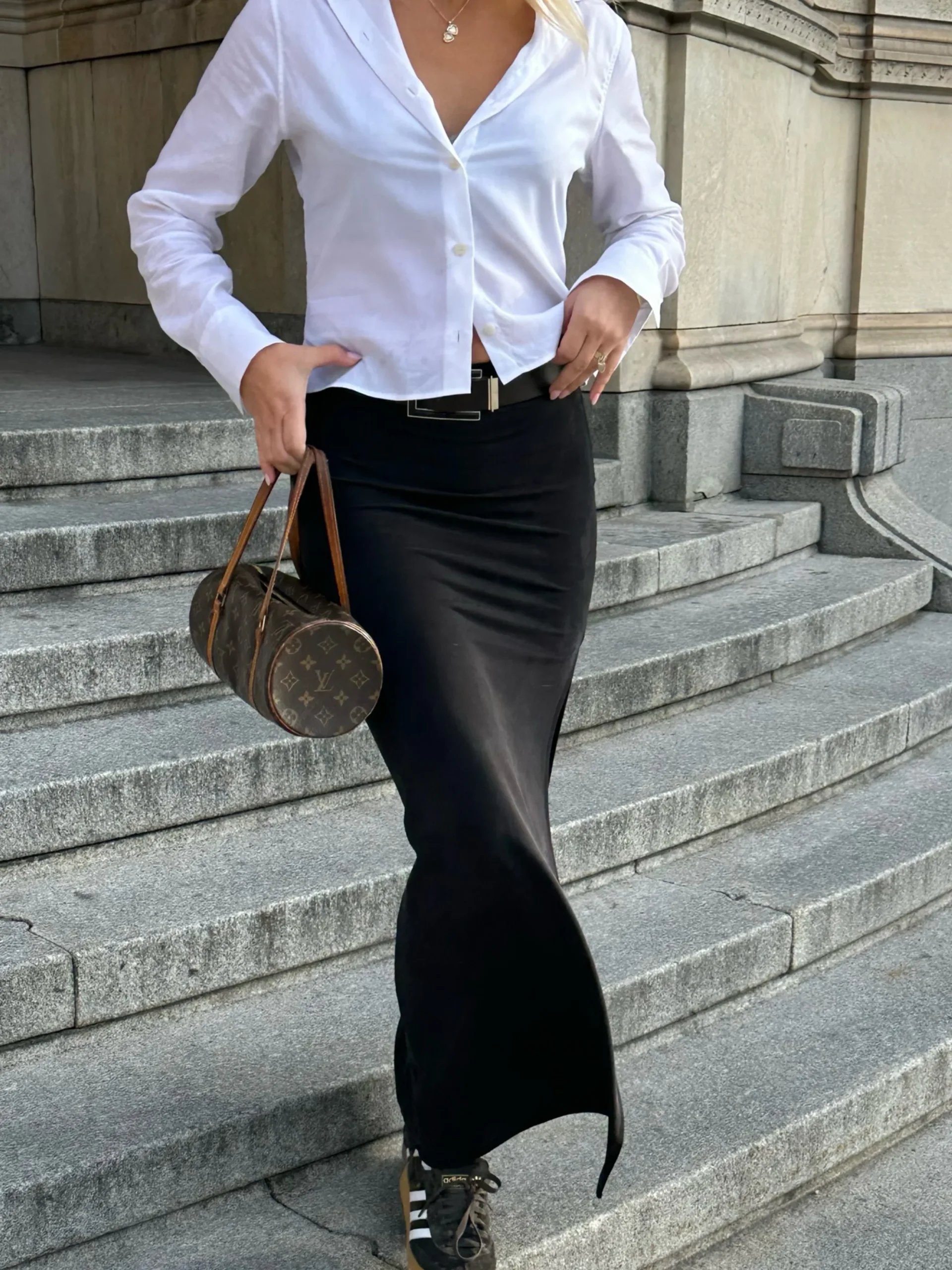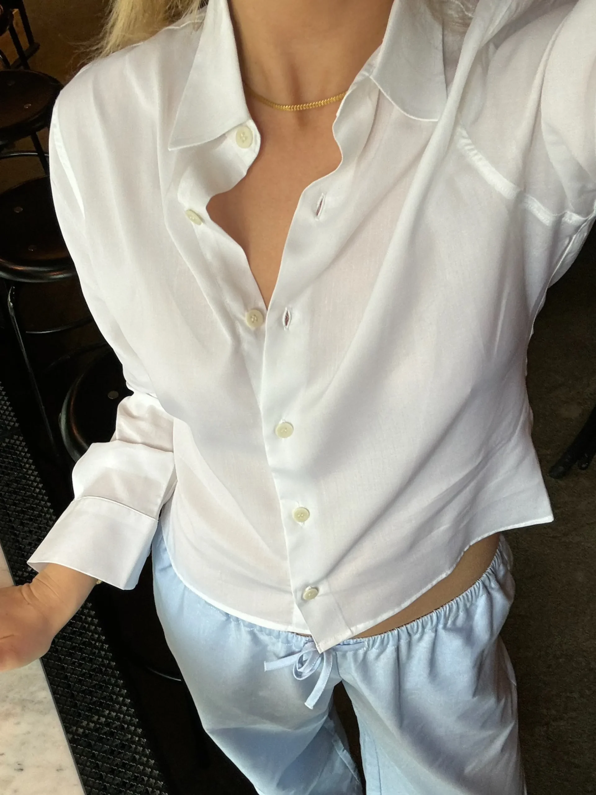 The Little Shirt is a shorter, fitted shirt made of a super soft and light TENCELâ„¢ Lyocell fabric. It has classic buttoning with corozo buttons in the front, a classic little collar and darts in the back for a fitted shape. We love to unbutton the cuffs and style it casually with jeans, suit pants or skirts.