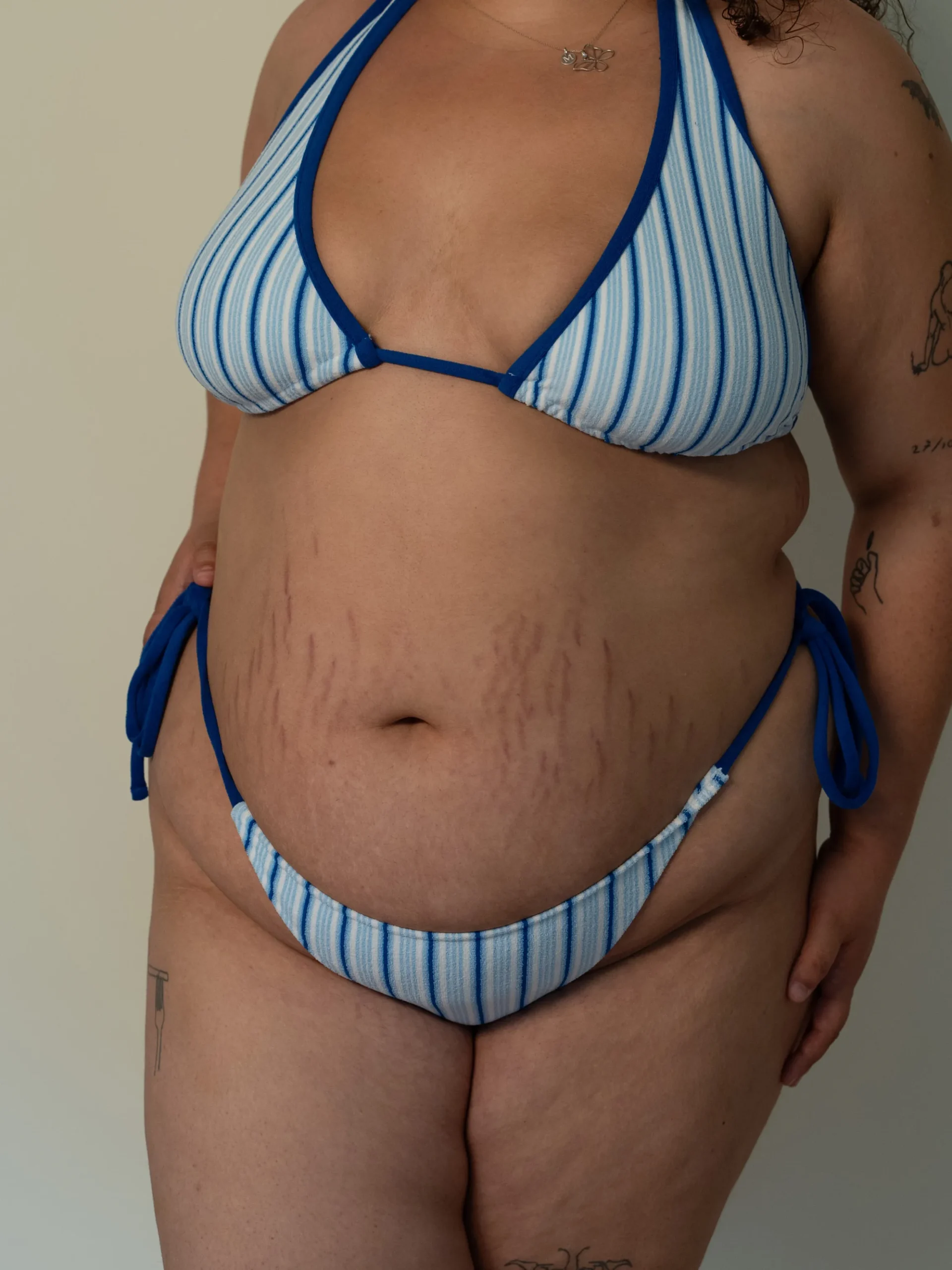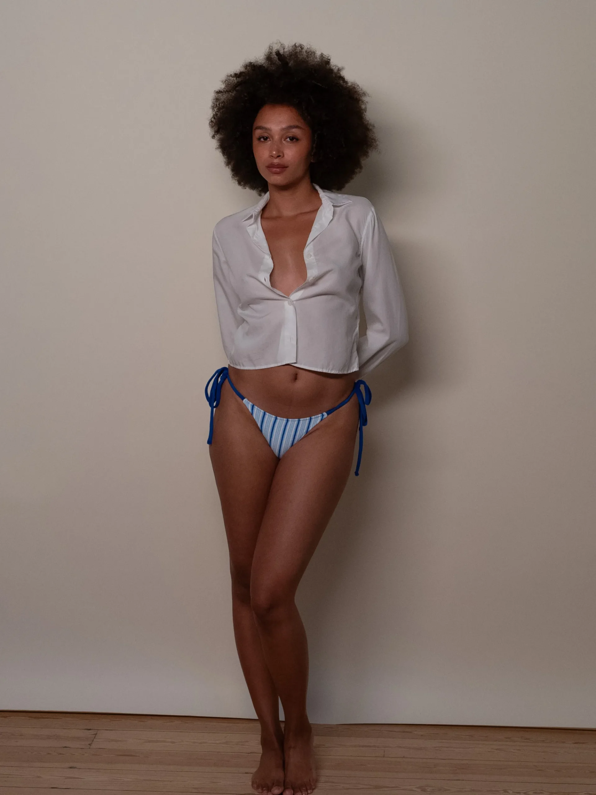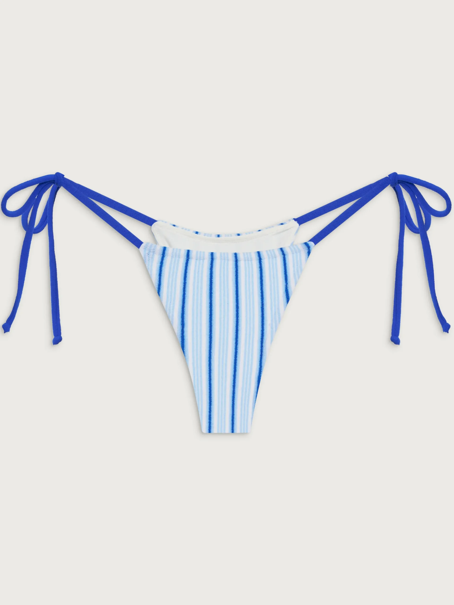 Designed with a low-rise fit and skimpy coverage, the Divine bikini bottom is an ultra-flattering beachside silhouette. Divine features adjustable side ties, extra soft terry cloth fabric, and a new blue striped print.