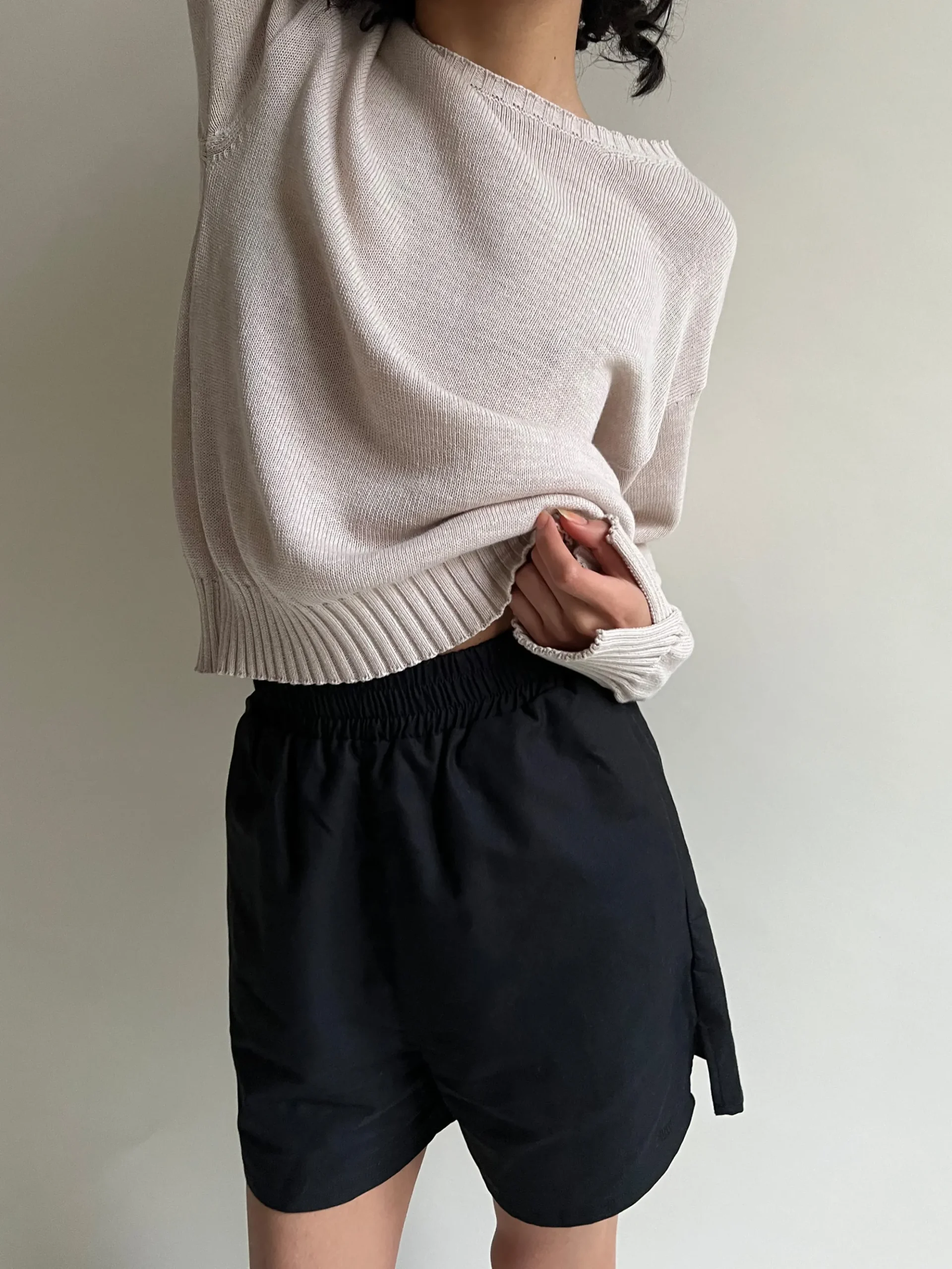 The Breezy Shorts made in 100% organic cotton could not be any dreamier. They have an elastic waist, side pockets, a decorative fake back pocket, small slits on sides, and our logo on the bottom edge. With their oversized and boxy fit, it is the ultimate set together with our Breezy Shirt.