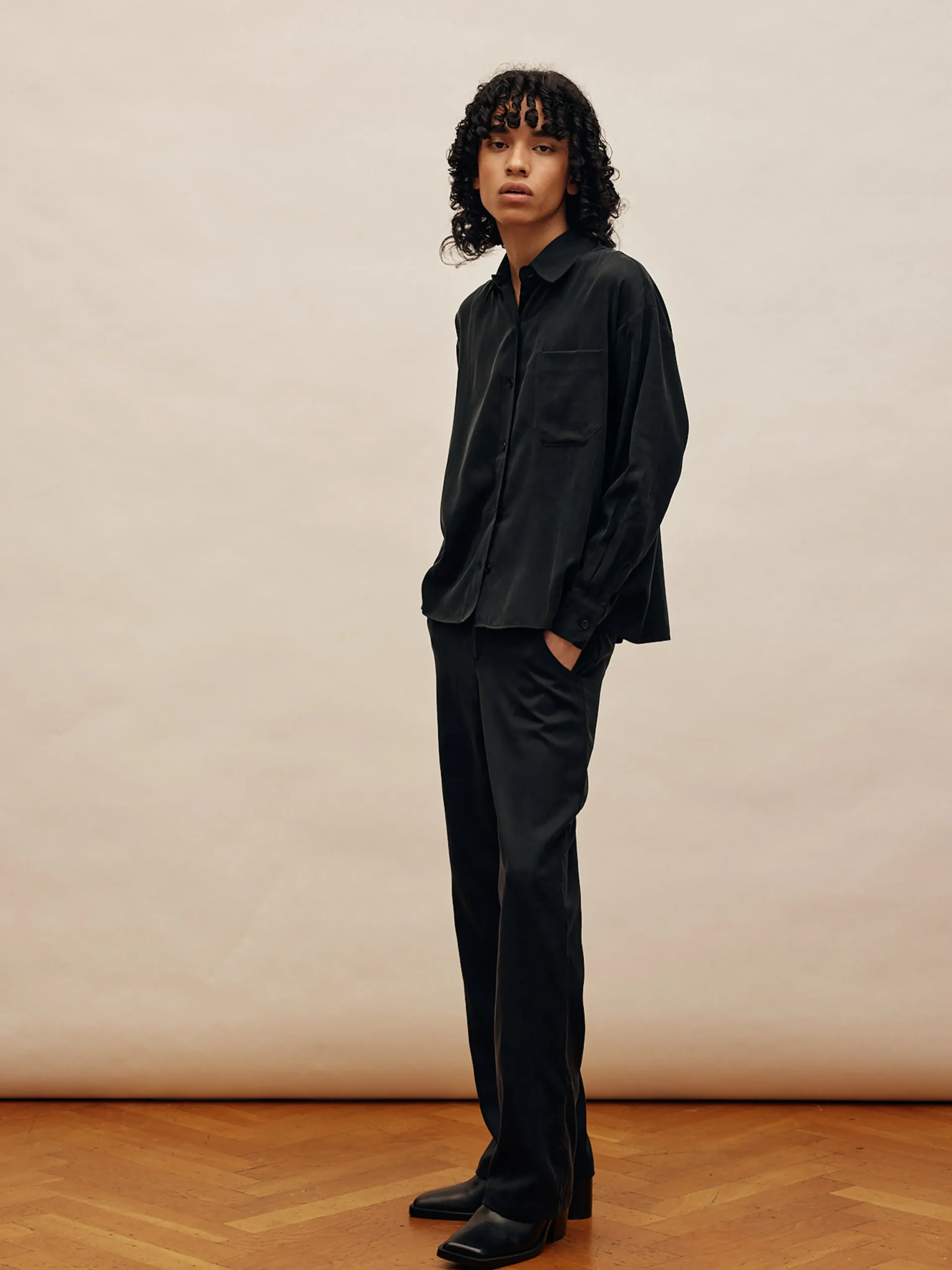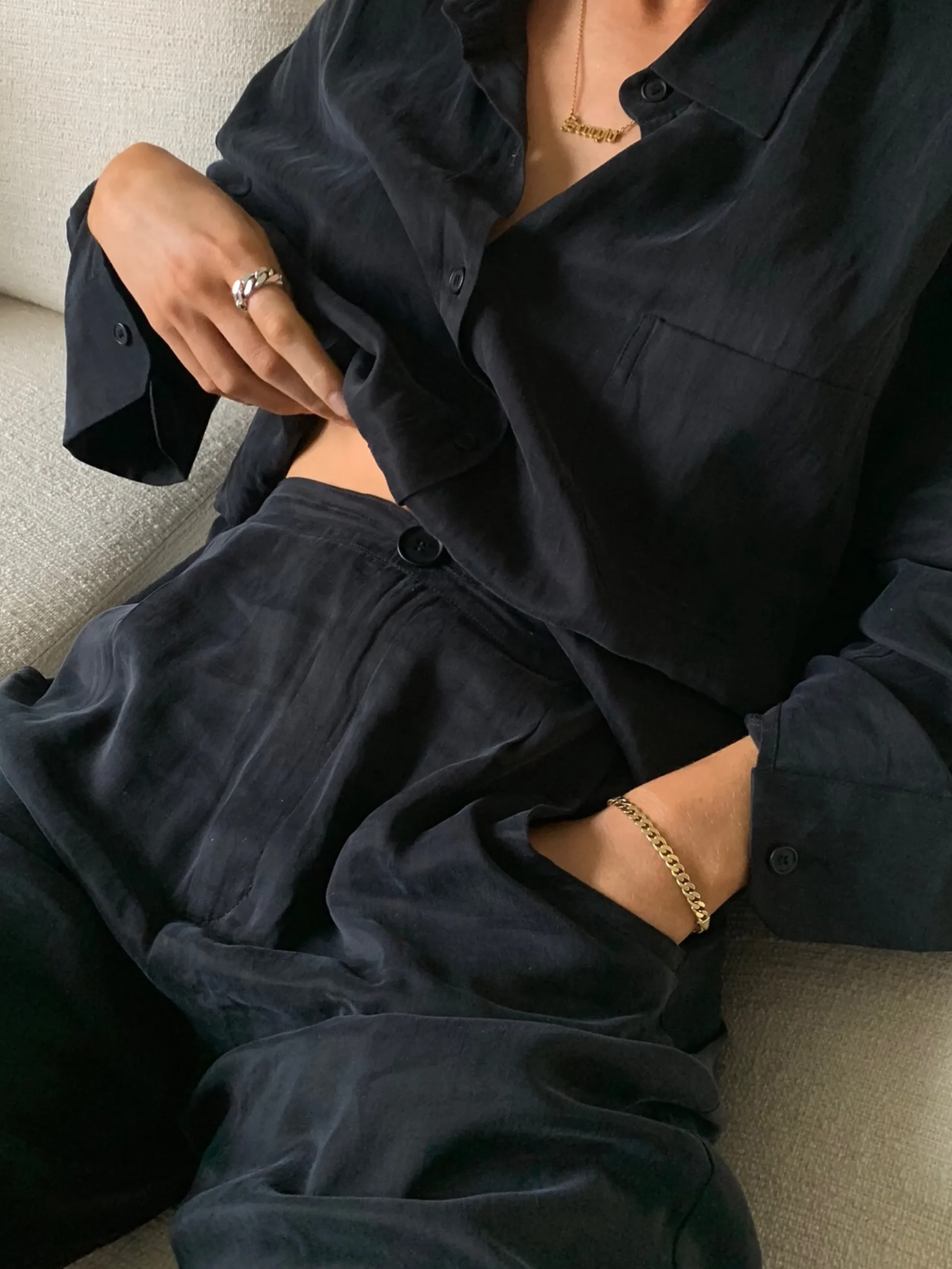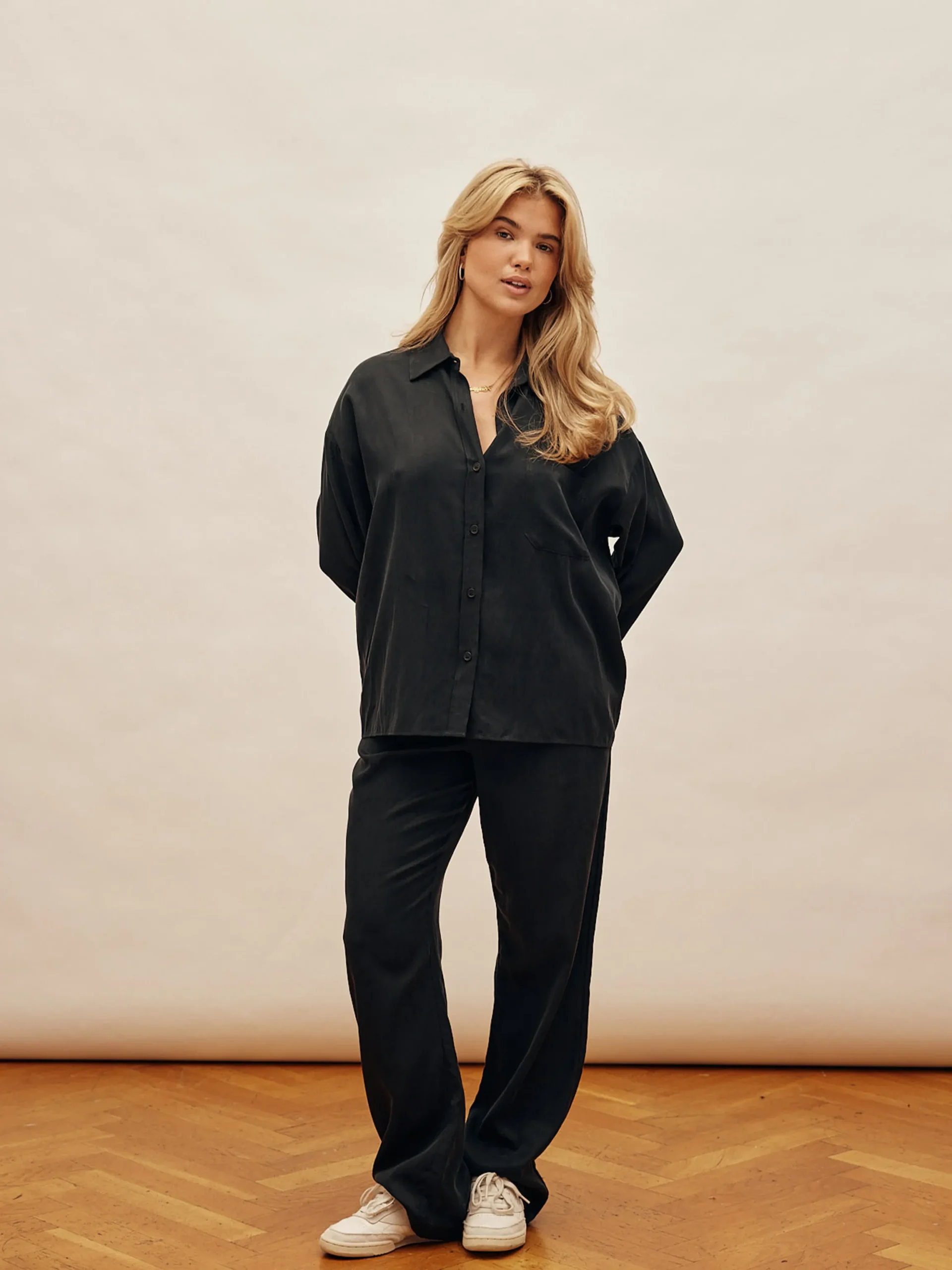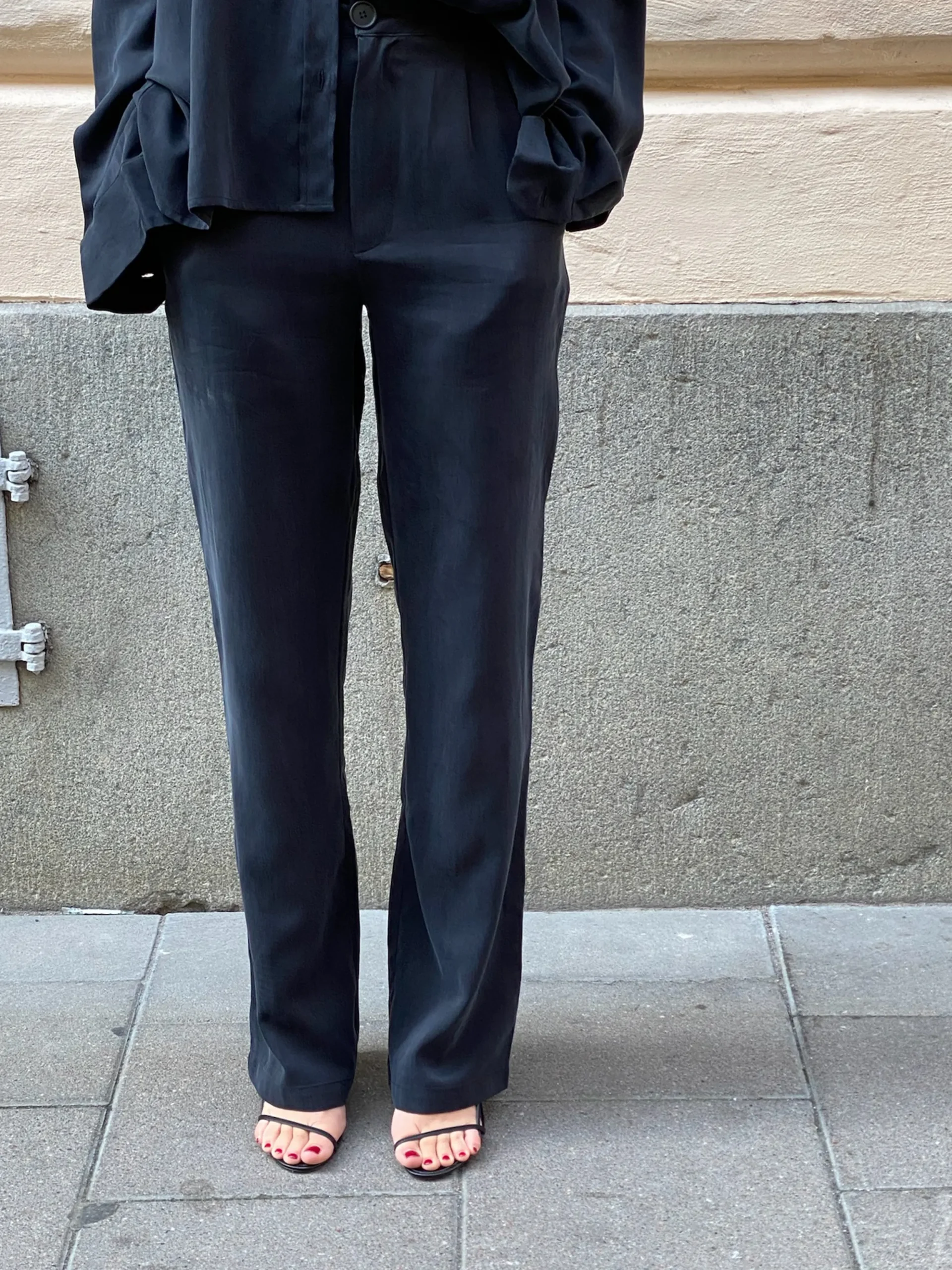Our On The Go Pants in cupro falls beautifully and has the softest peachy touch. With an elastic waistband in the back, they offer ultimate comfort around the waist, while the real pockets and zip- and button closure in the front shows a more dressed up look. They're comfortable enough to wear to the airport but looks put together enough for a dinner at a restaurant.