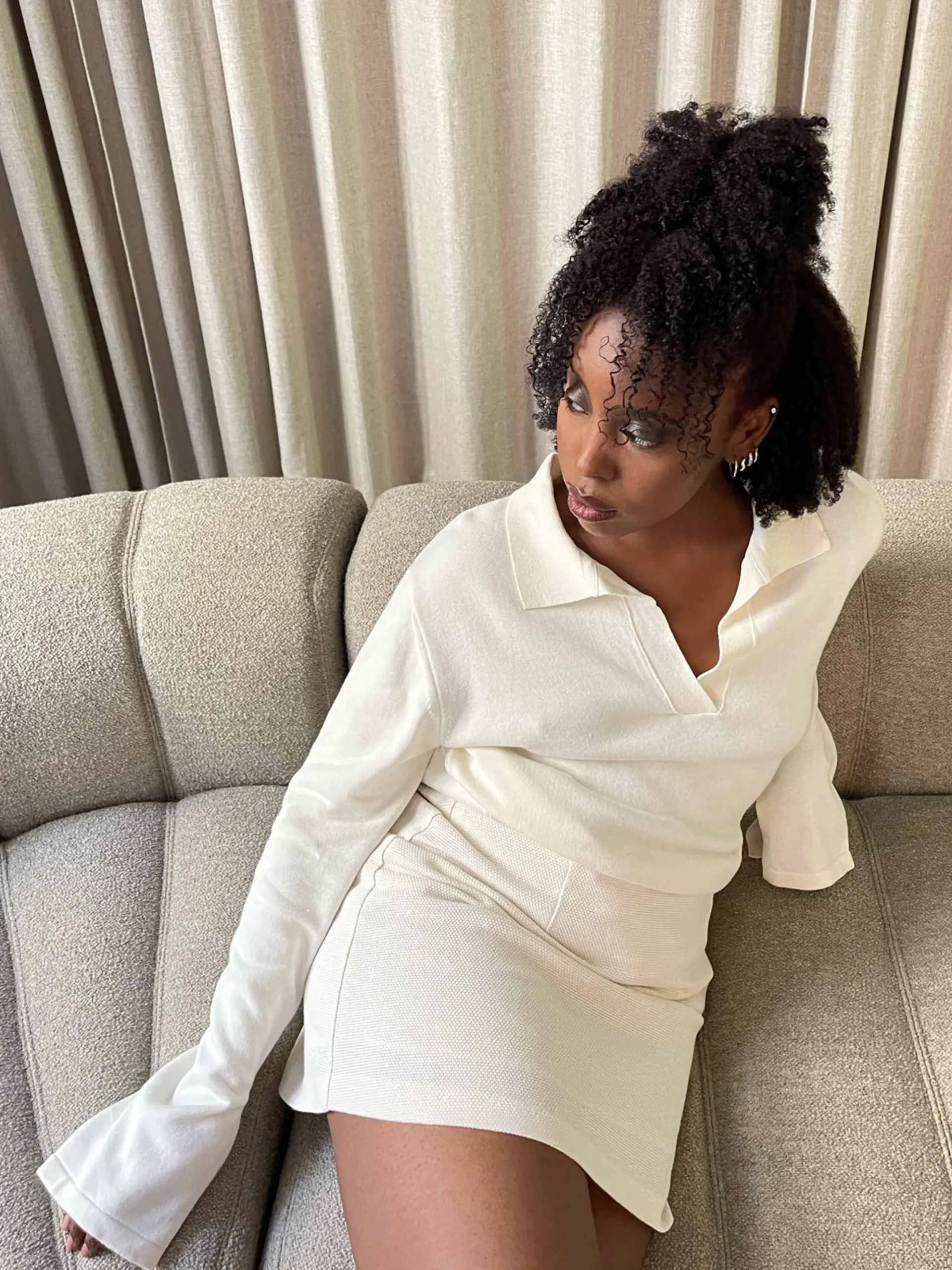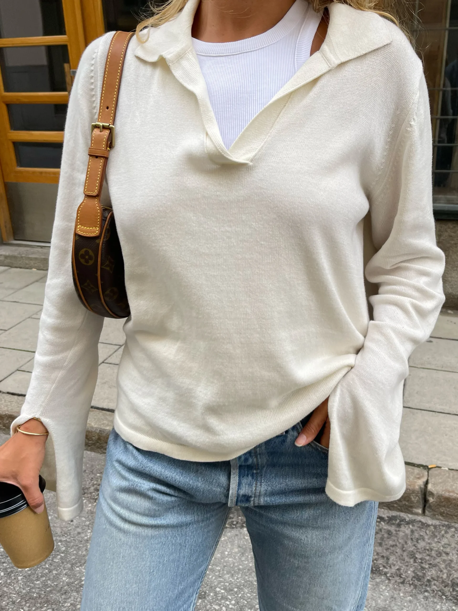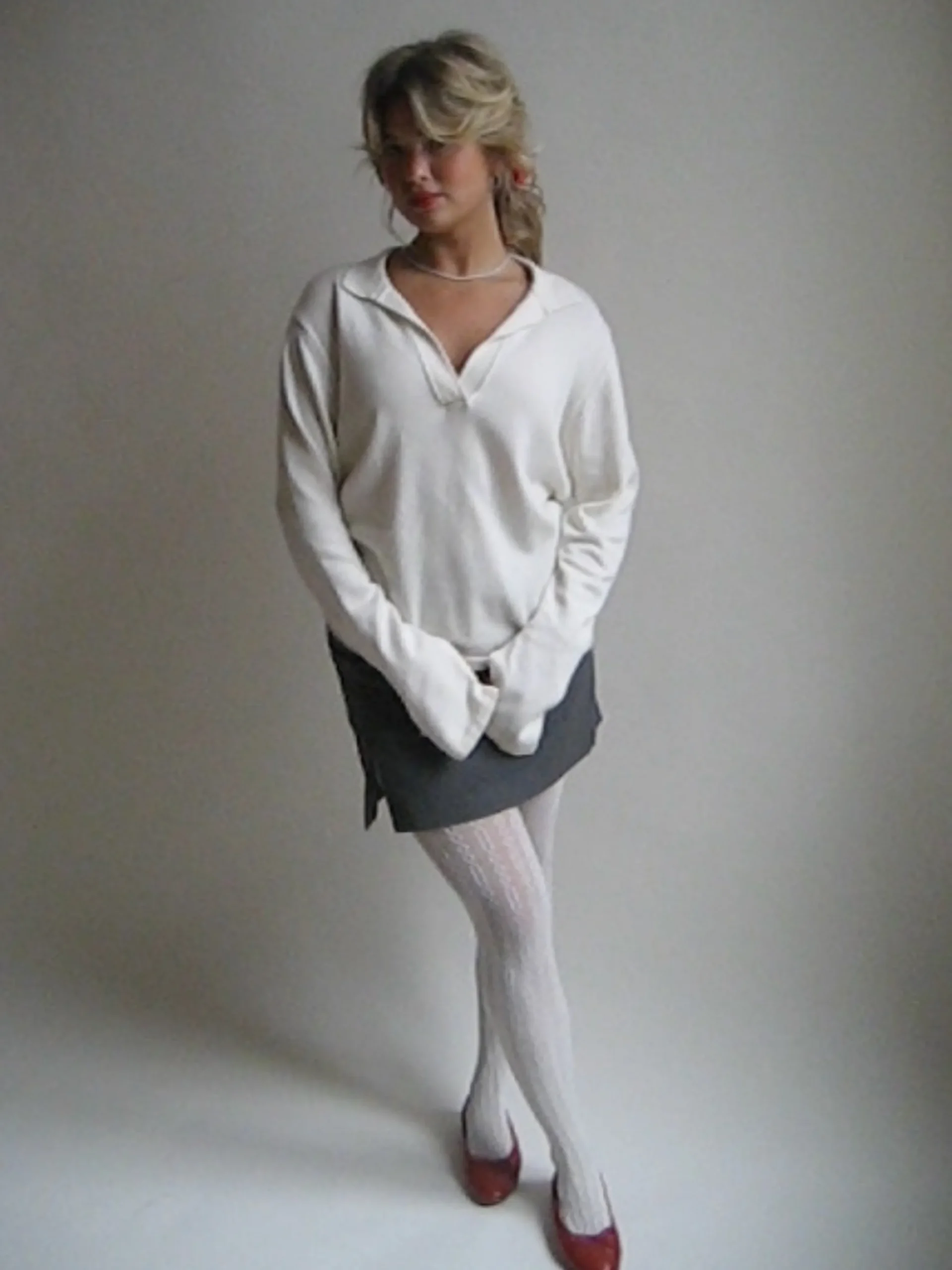 The Getaway top is made out of 100% organic cotton. It is comfortable, stylish and easy to dress up and down. It has a relaxed collar and a V-neck front and slits at the ends of the slightly too long sleeves.