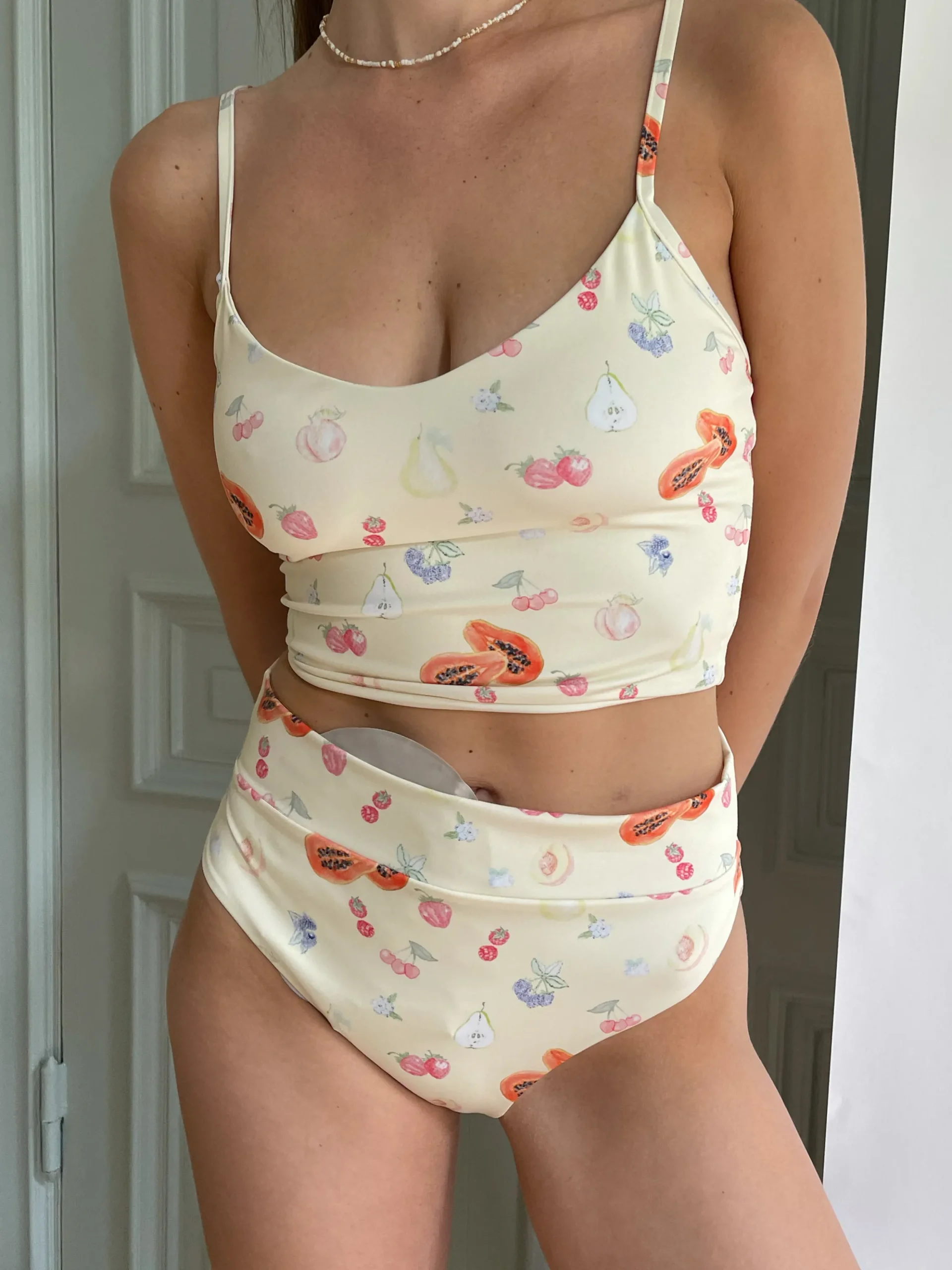 Our High Waisted Bottoms has quite a high-cut leg but offers more coverage than our Cheeky Bottoms. All of our swimwear is made in a certified recycled polyester blend from Italy.Copyrighted print