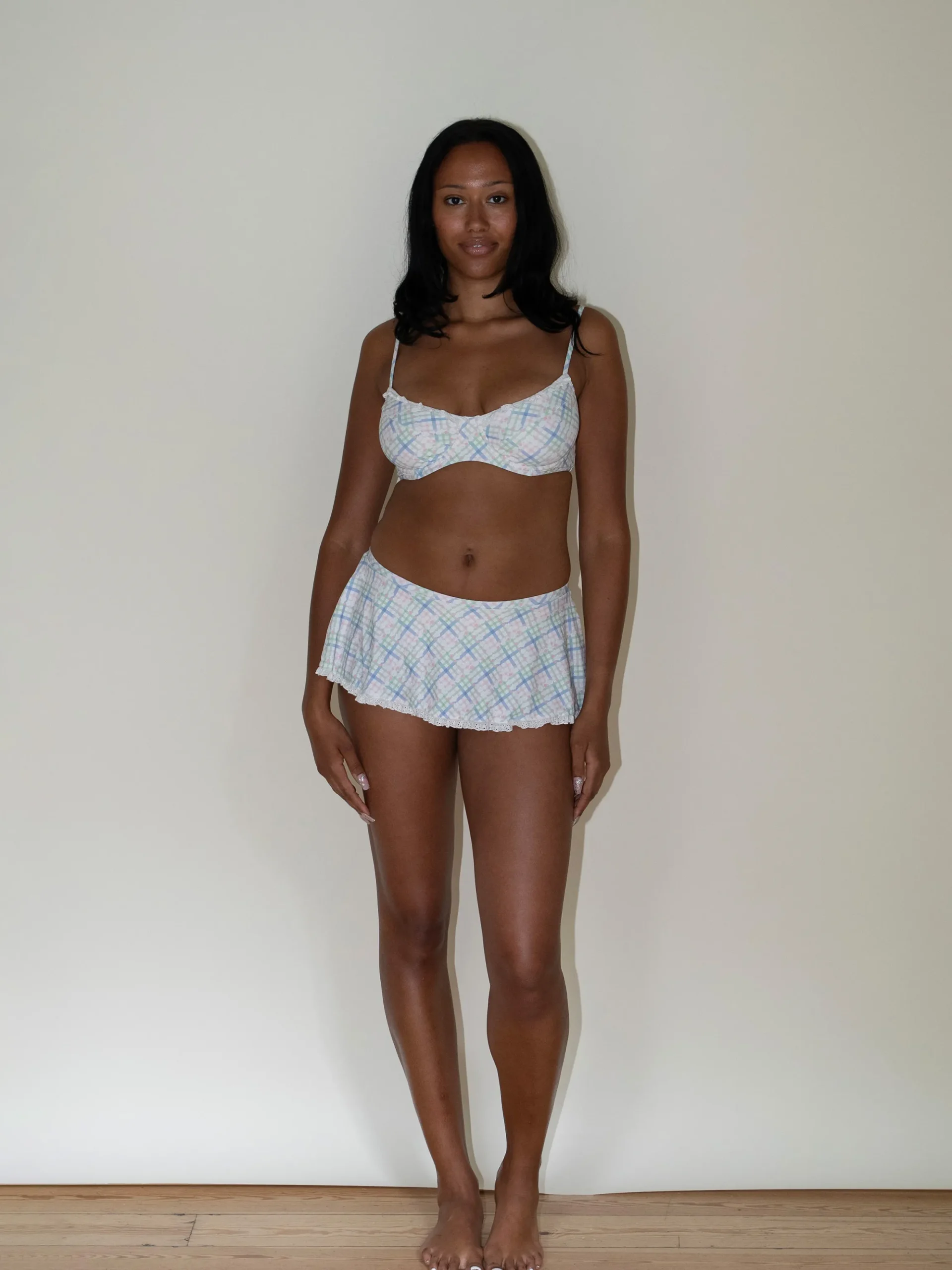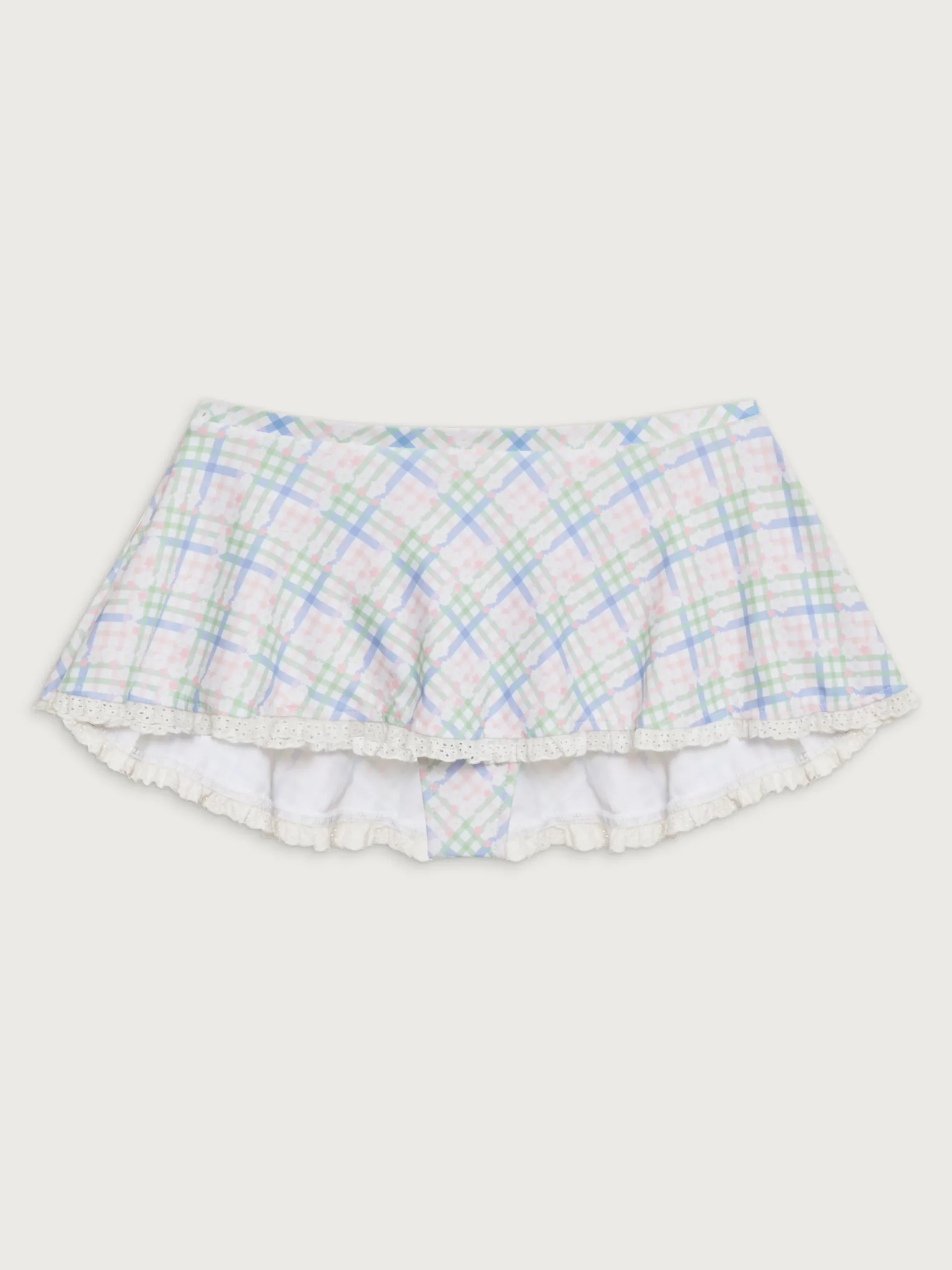 Our swim skirt-style bikini bottom is an early 2000s dream come true. Izabella features a bow detail, a skirt top layer, and a low-rise fit that hugs the hips. Designed with an eye-catching pastel plaid print and a thong liner, this swim skirt can be worn at any stage of the endless summer.