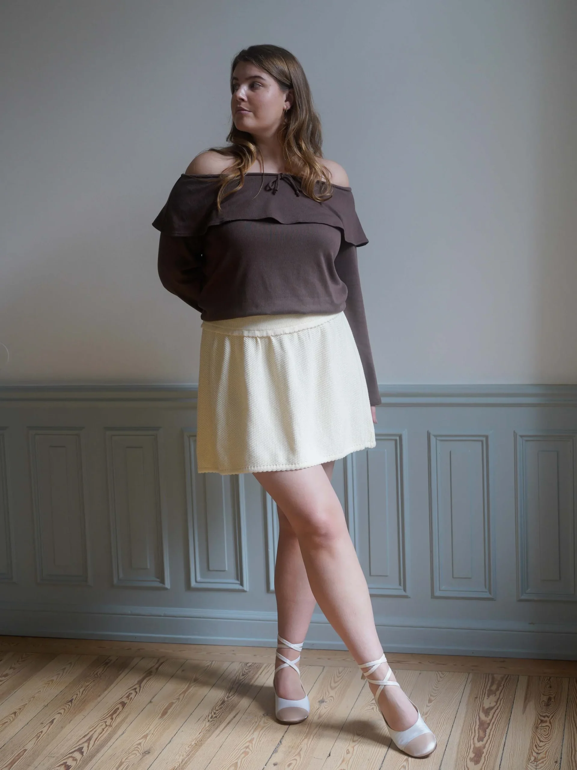 A mini skirt in the same knitted structure as our Principessa Skirt and Amorini Top and Cardigan. It has a little ruffle at the waistband, a scalloped edge and is slightly A-lined.