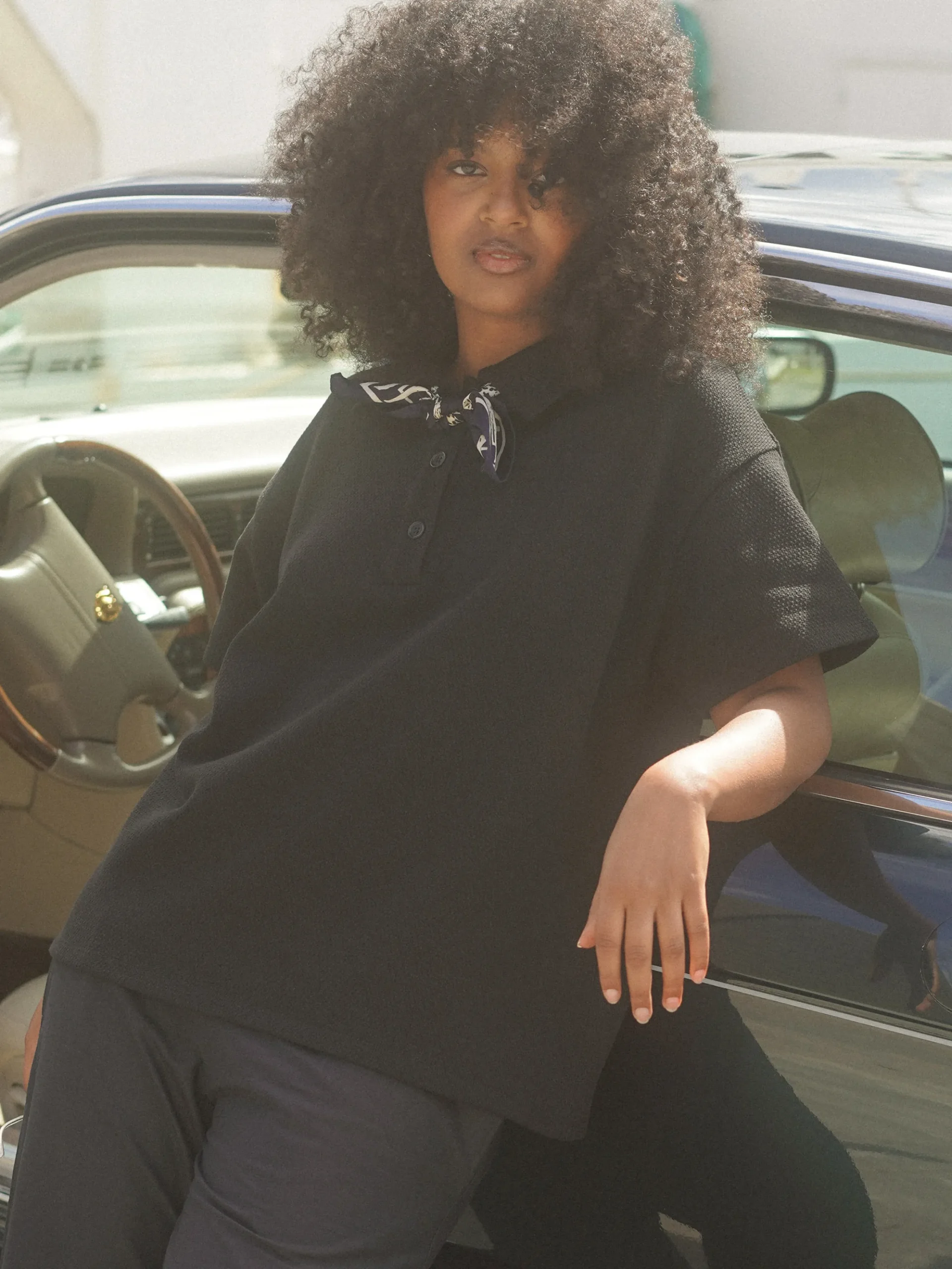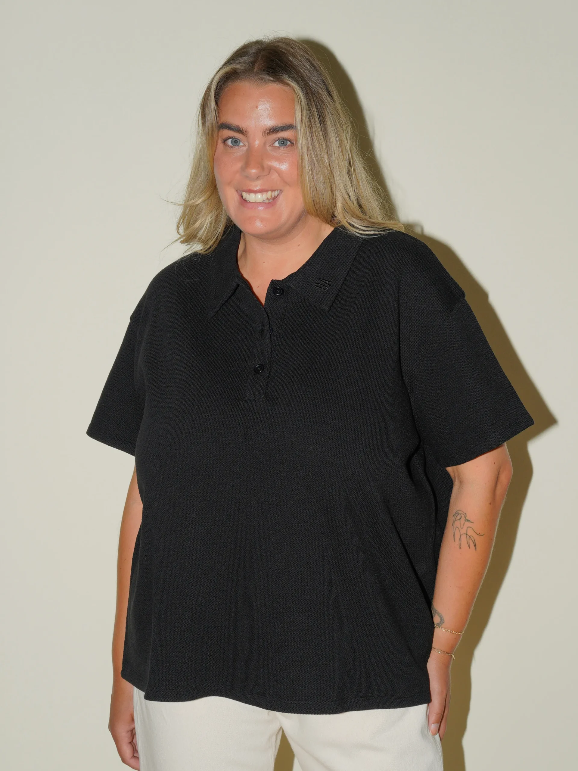 With a combination between sporty features from a classic polo shirt, and an oversized and modern fit, this top is a great addition to your everyday wardrobe. The textured fabric is made from soft organic cotton and the classic collar has an embroidered DA logo. It is made to fit relaxed and can be matched with both skirts and pants.
