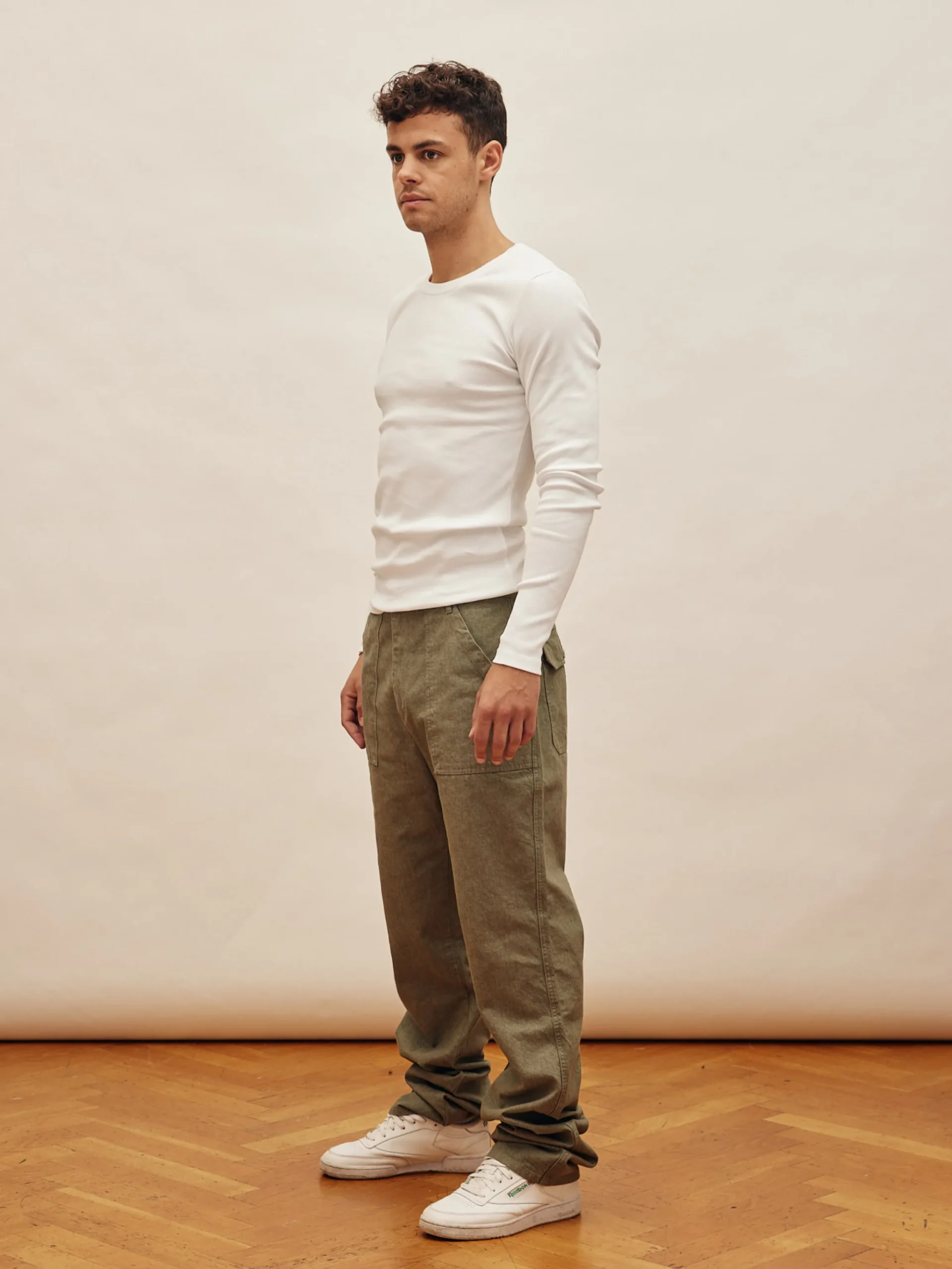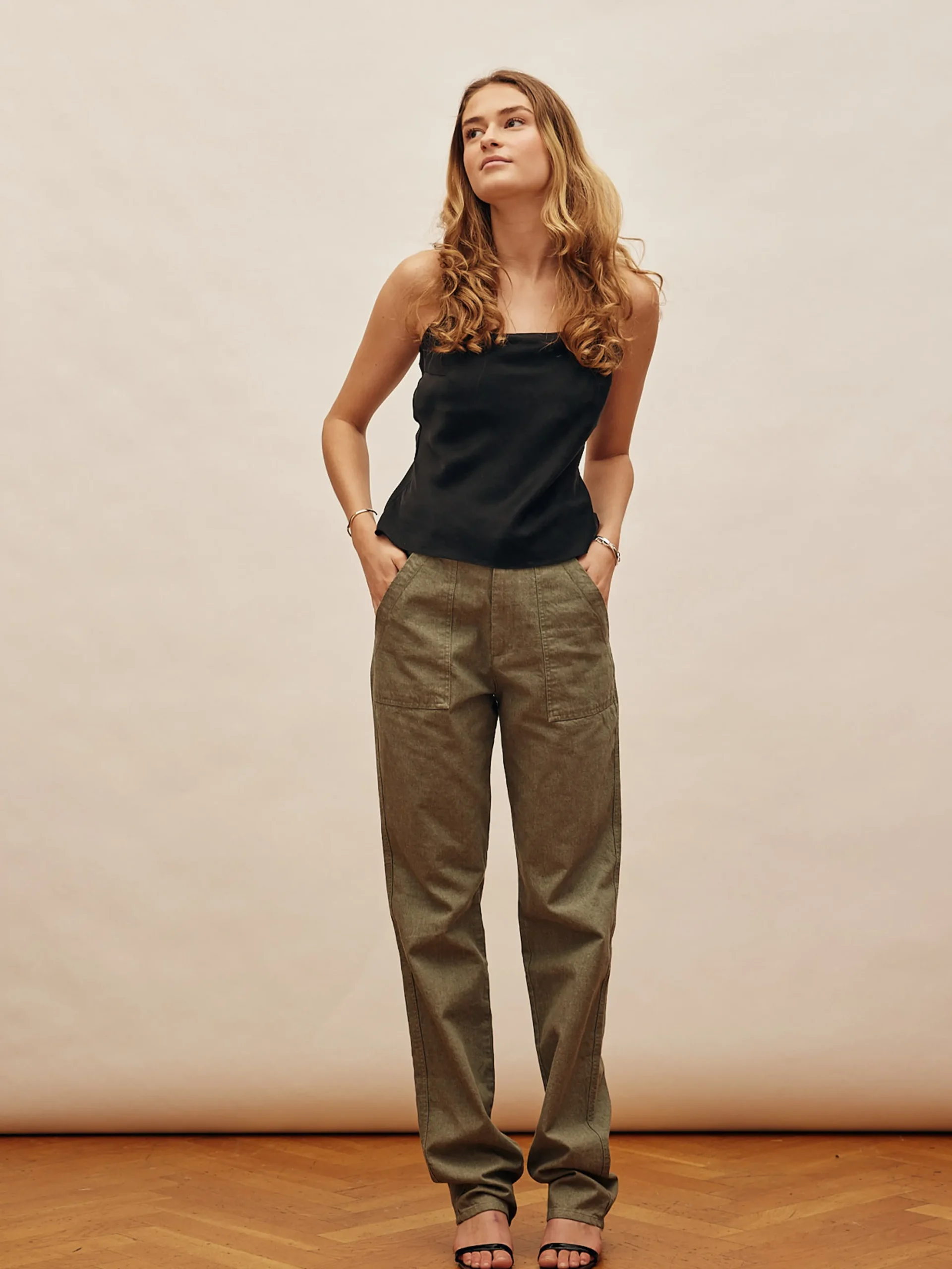 Our Go to pants have a loose, straight fit and are made from a thick cotton fabric. They have two front pockets and two in the back with button fastenings and stitching details. Available in two lengths, our regular and tall version.
