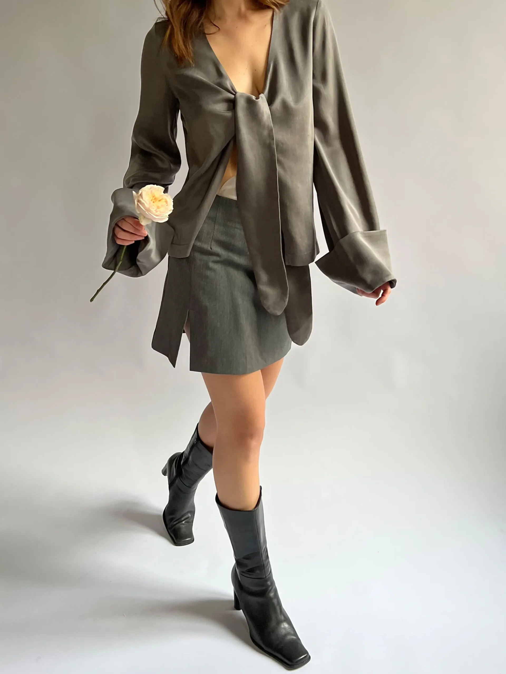 Our Tie Top Long Sleeve in storm has a tie closure at the front and exaggerated long sleeves. Made out of silky cupro fabric, our Tie Top Long Sleeve has a peachy surface and drapes beautifully. Style it with our matching Vision Skirt in storm to get the complete look!