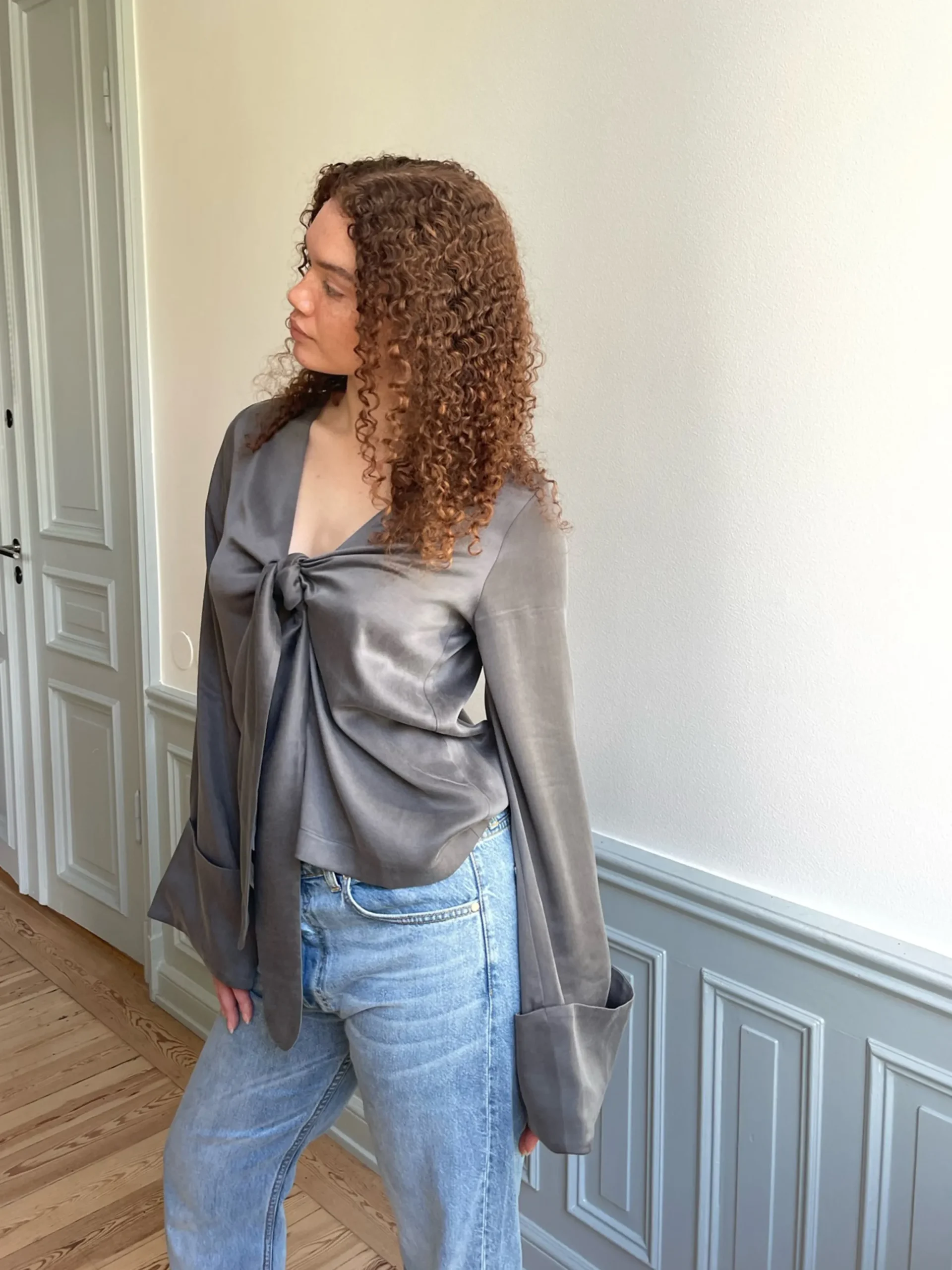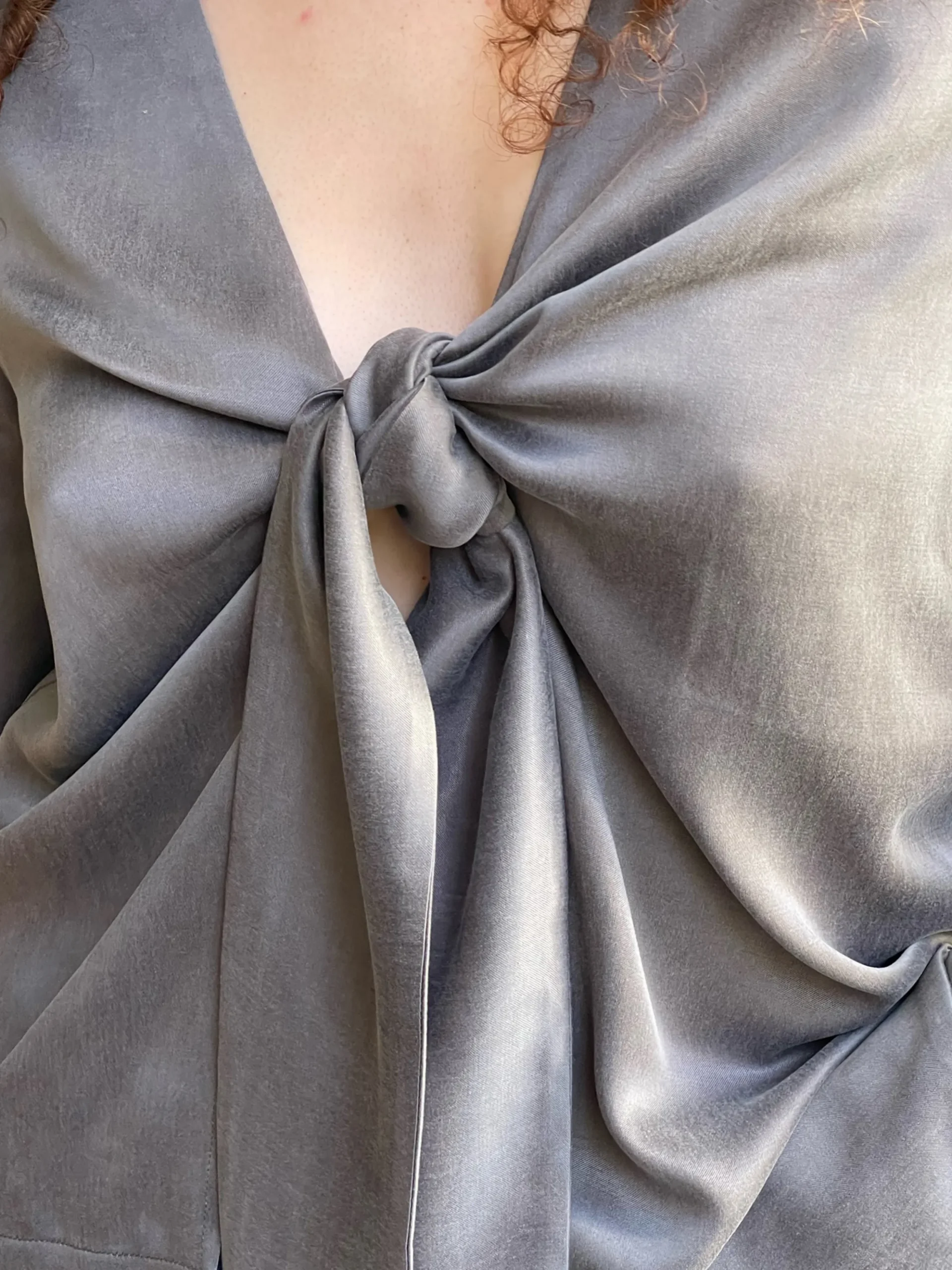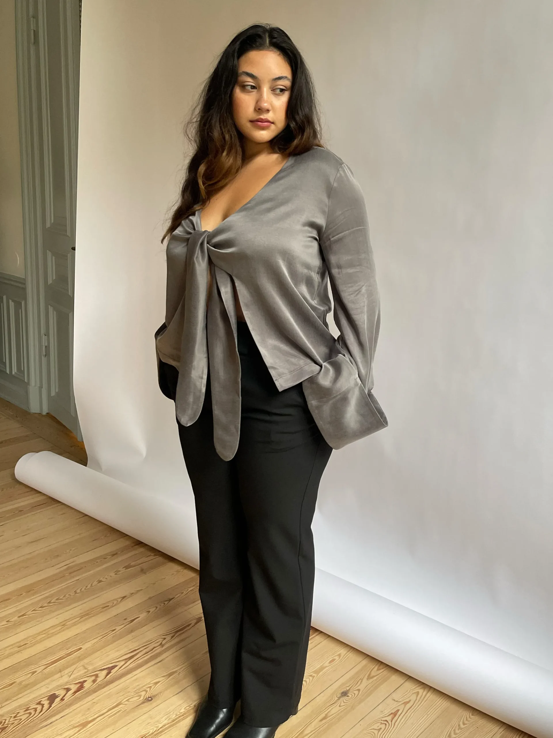 Our Tie Top Long Sleeve in storm has a tie closure at the front and exaggerated long sleeves. Made out of silky cupro fa…
