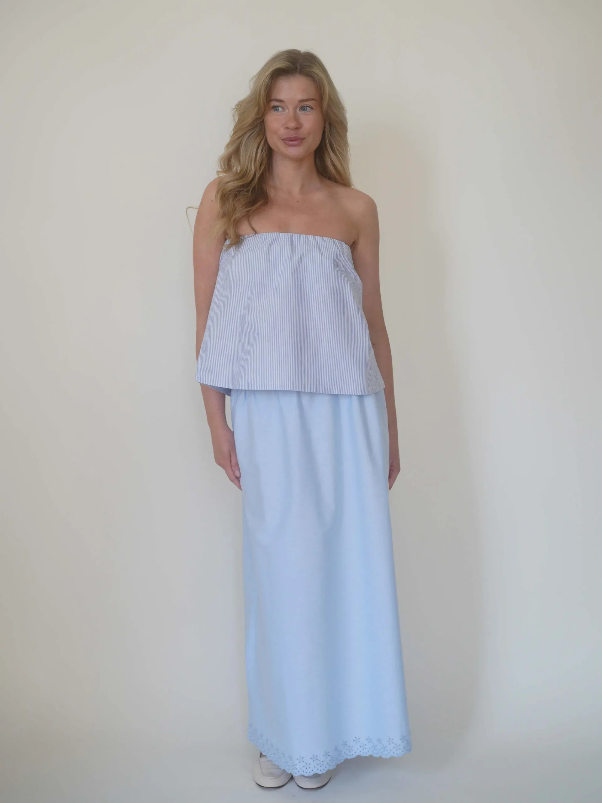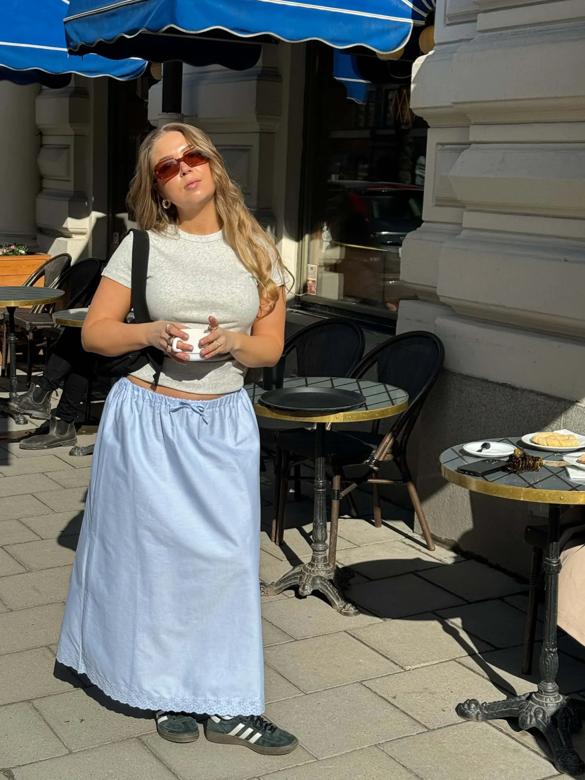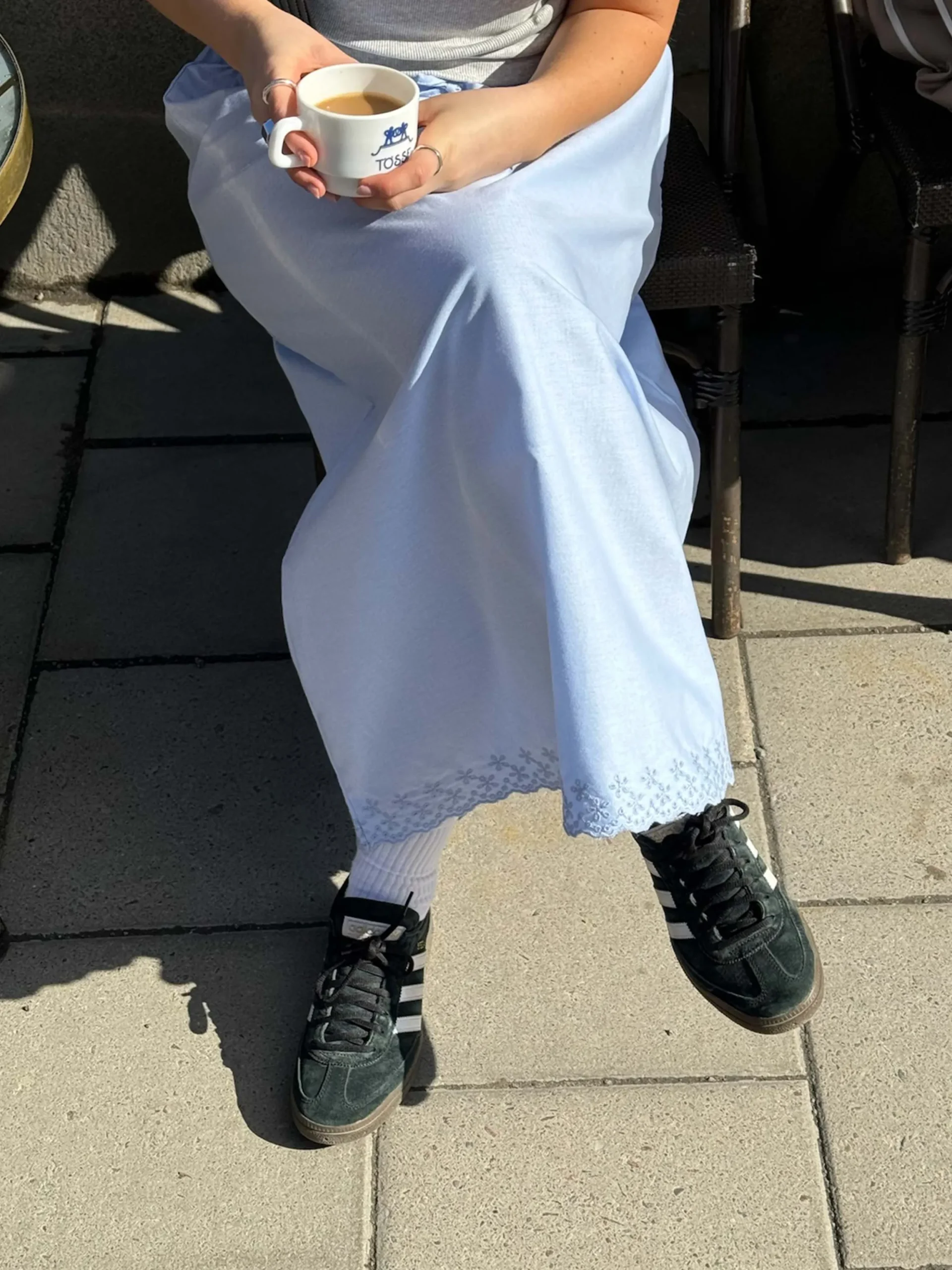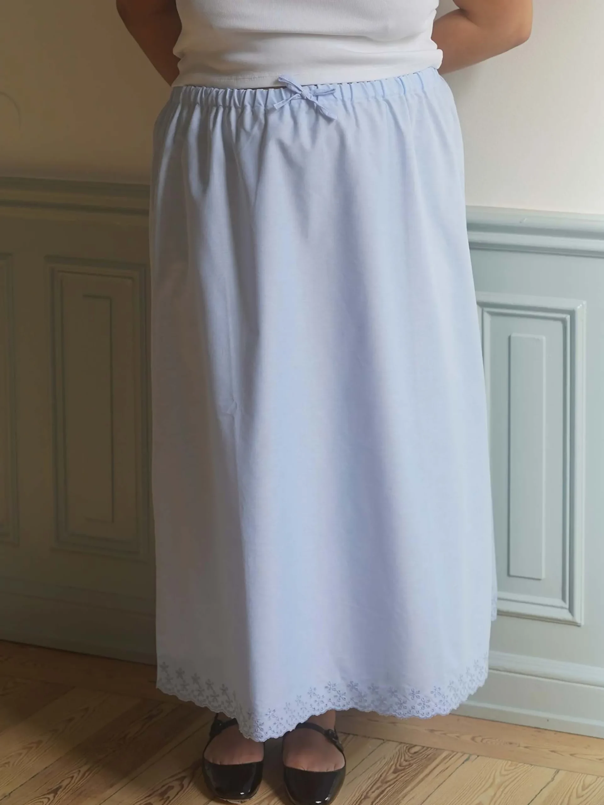 The Breezy Midi Skirt is a comfortable skirt with an embroidered edge at the bottom. Thanks to the elastic waistband it can be worn at different positions in the waist, and it is easy to style and wear in different ways. We love to wear it together with Breezy Shirts, Daily Tank Tops or a knitted Crewneck Sweater.
