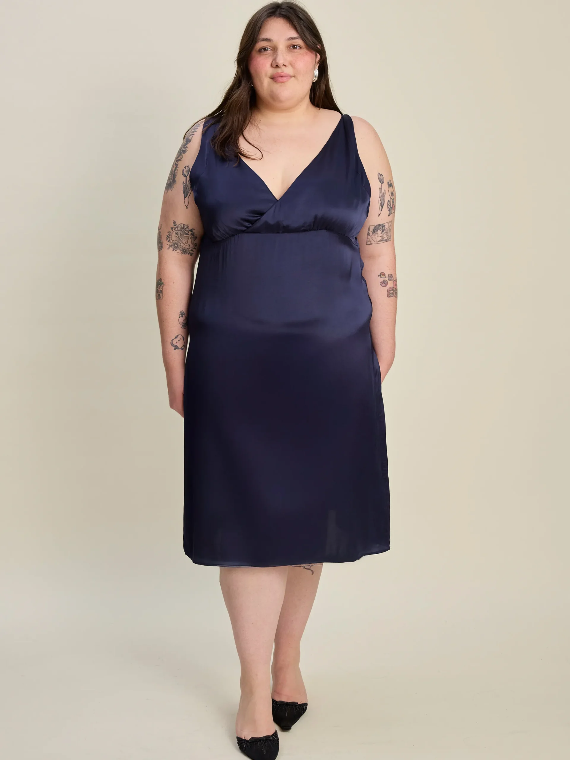 Designed for special occasions, the Evening Midi Dress is made from a delicate viscose satin fabric that has a beautiful shine. The V-neckline and midi length make it comfortable and easy to wear. We love pairing it with the Evening Scarf for a complete dressed-up and elegant look.