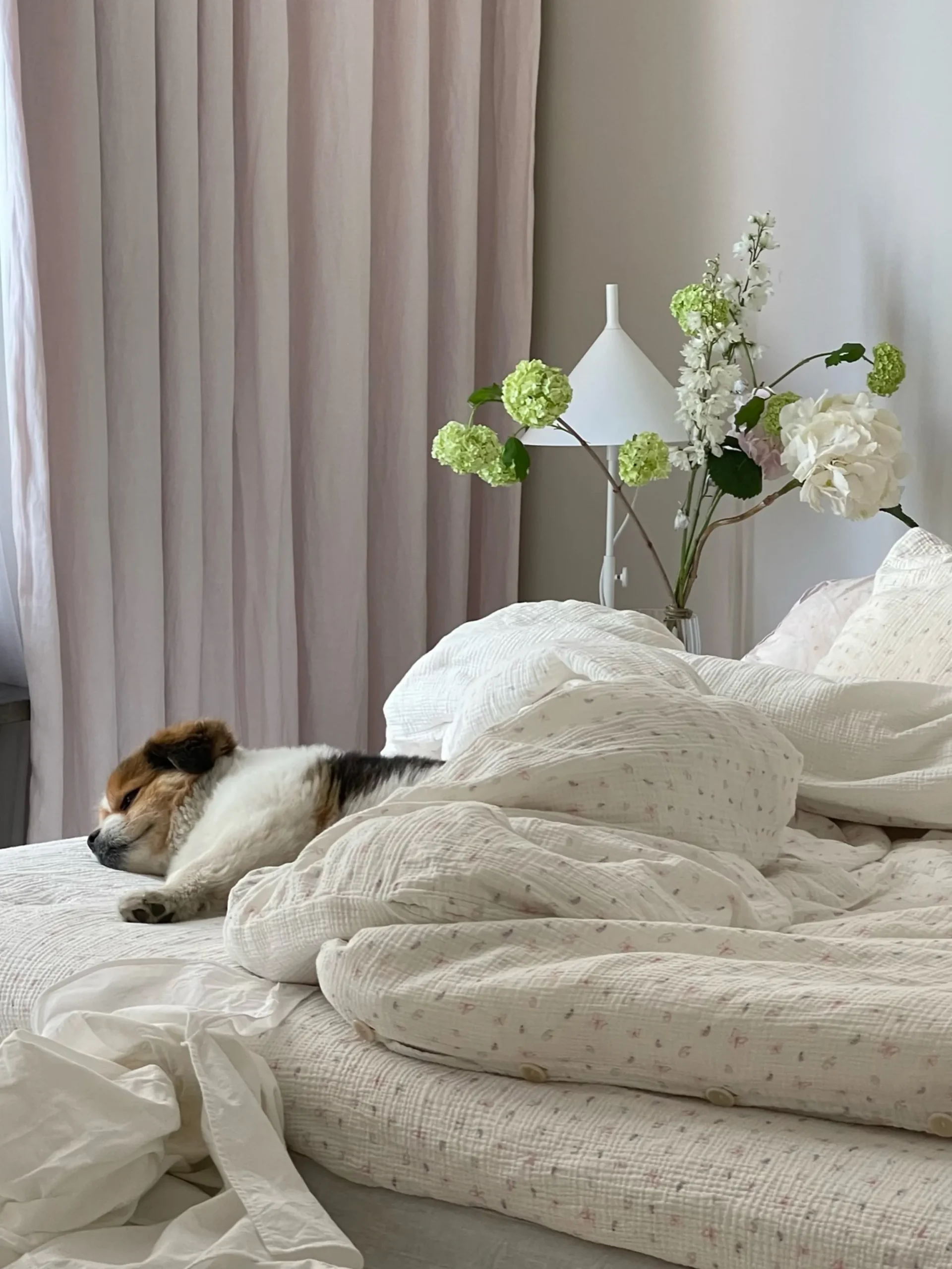 This bedding is made out of the softest muslin cotton fabric that we could possibly find! Our unique print together with the luxurious quality of organic cotton fabric, makes us want to never get out of bed. The duvet covers have corozo buttons at the bottom for both closure and to keep the duvet in place, while the pillow cases have an inside pocket to keep the pillow in place. The duvet covers has one side in a solid color and the other with a pattern.
