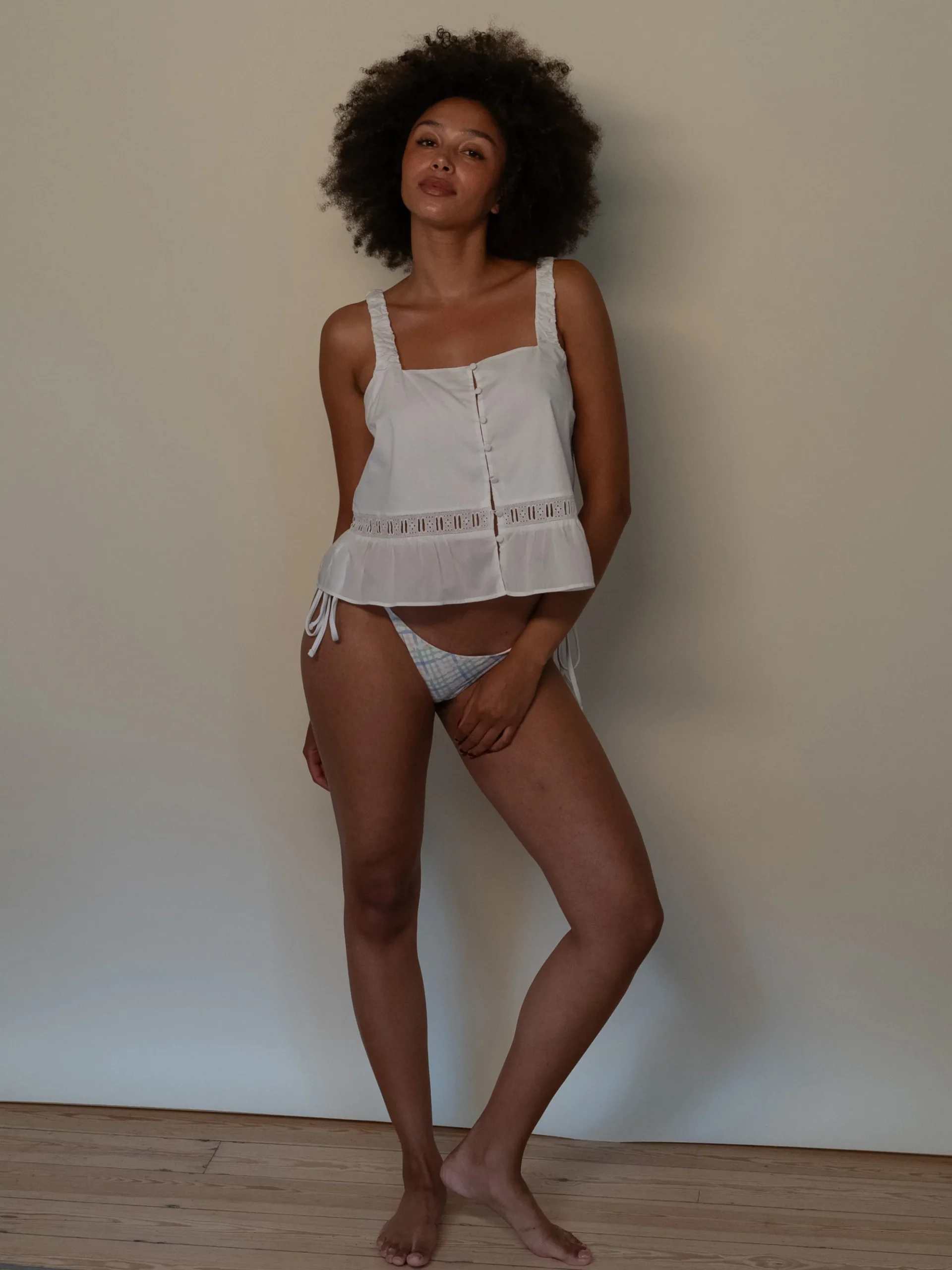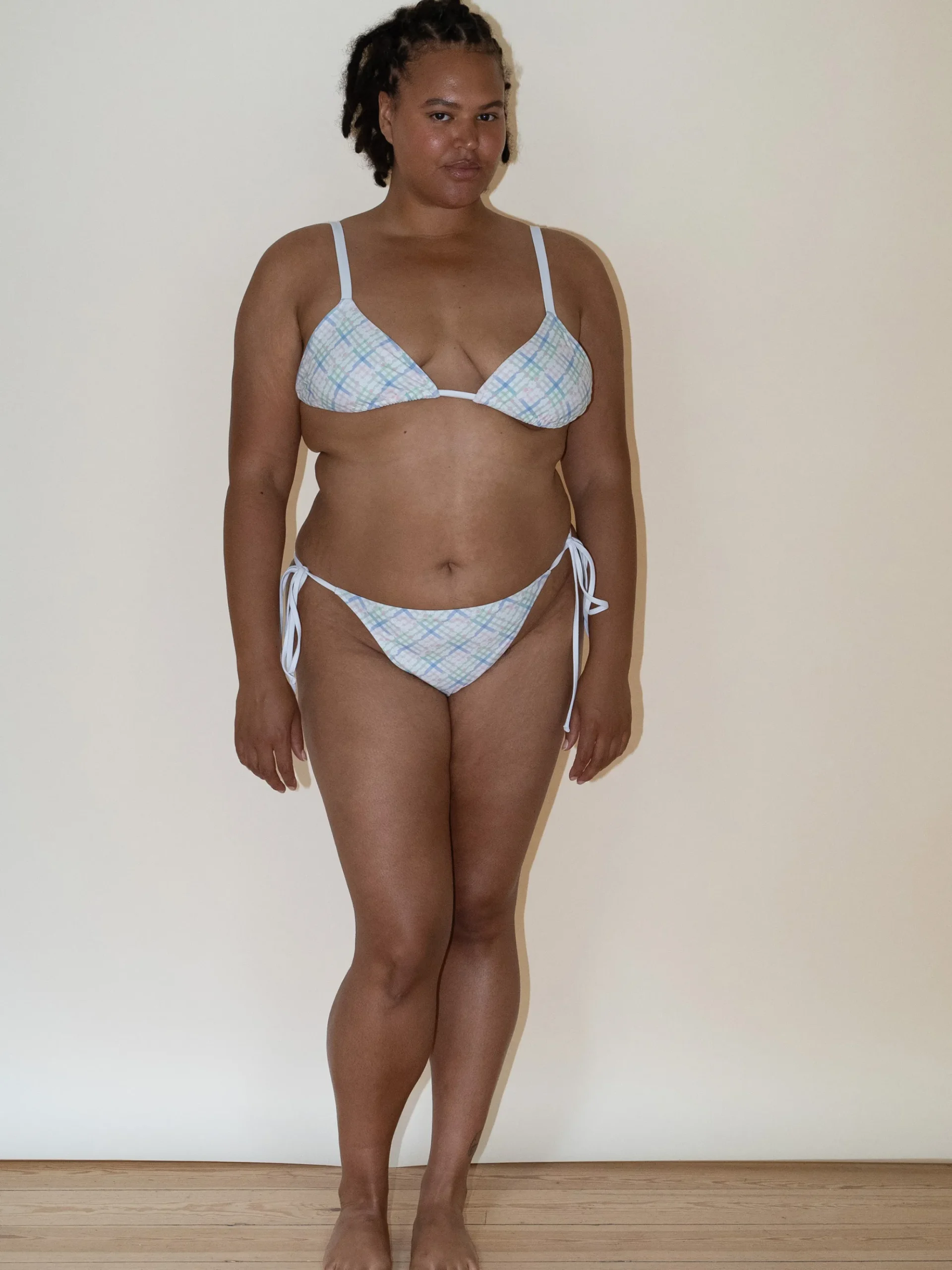 Designed with a low-rise fit and skimpy coverage, the Divine bikini bottom is an ultra-flattering beachside silhouette. Divine features adjustable side ties and an eye-catching pastel plaid print with tiny white flowers.