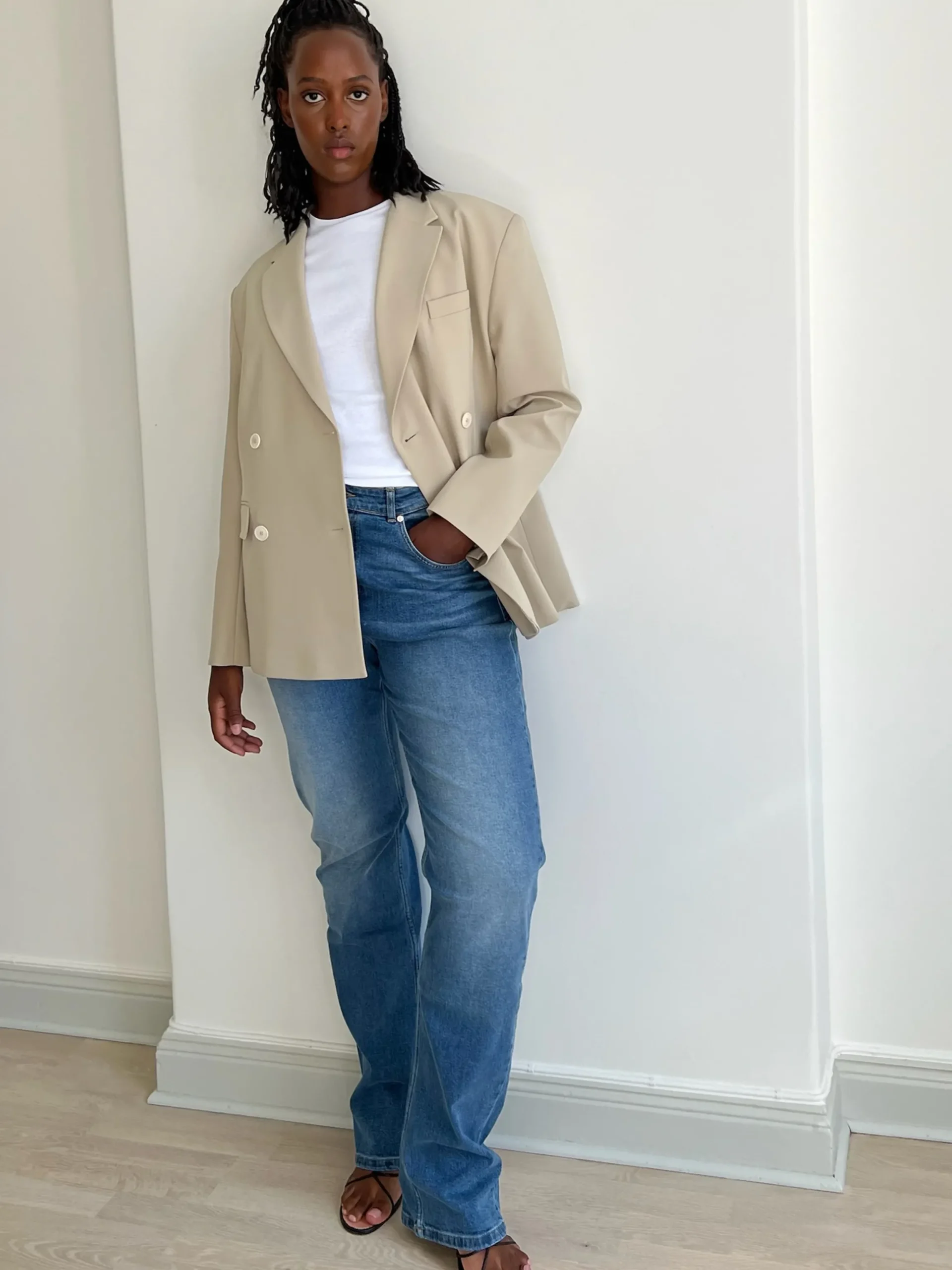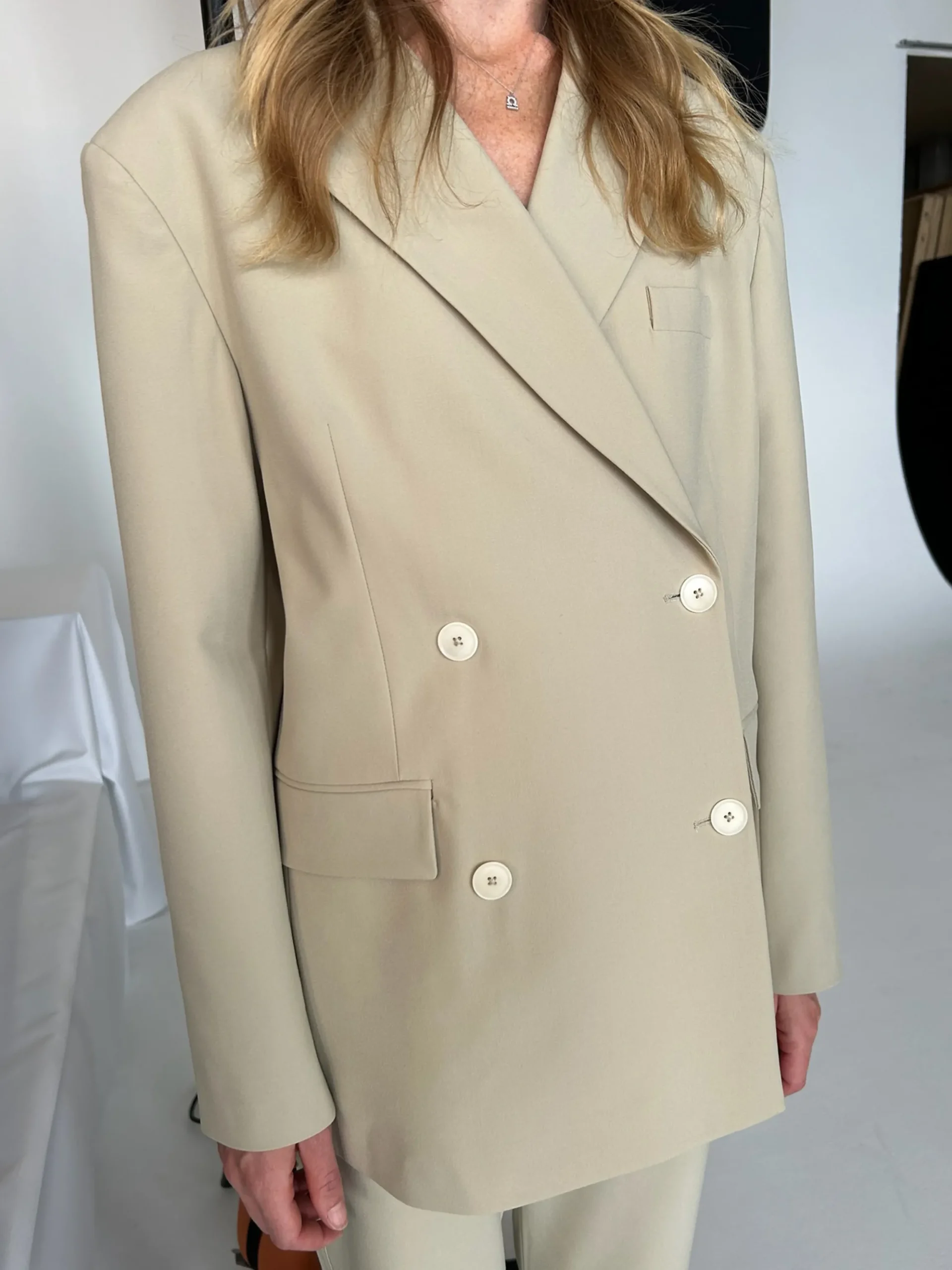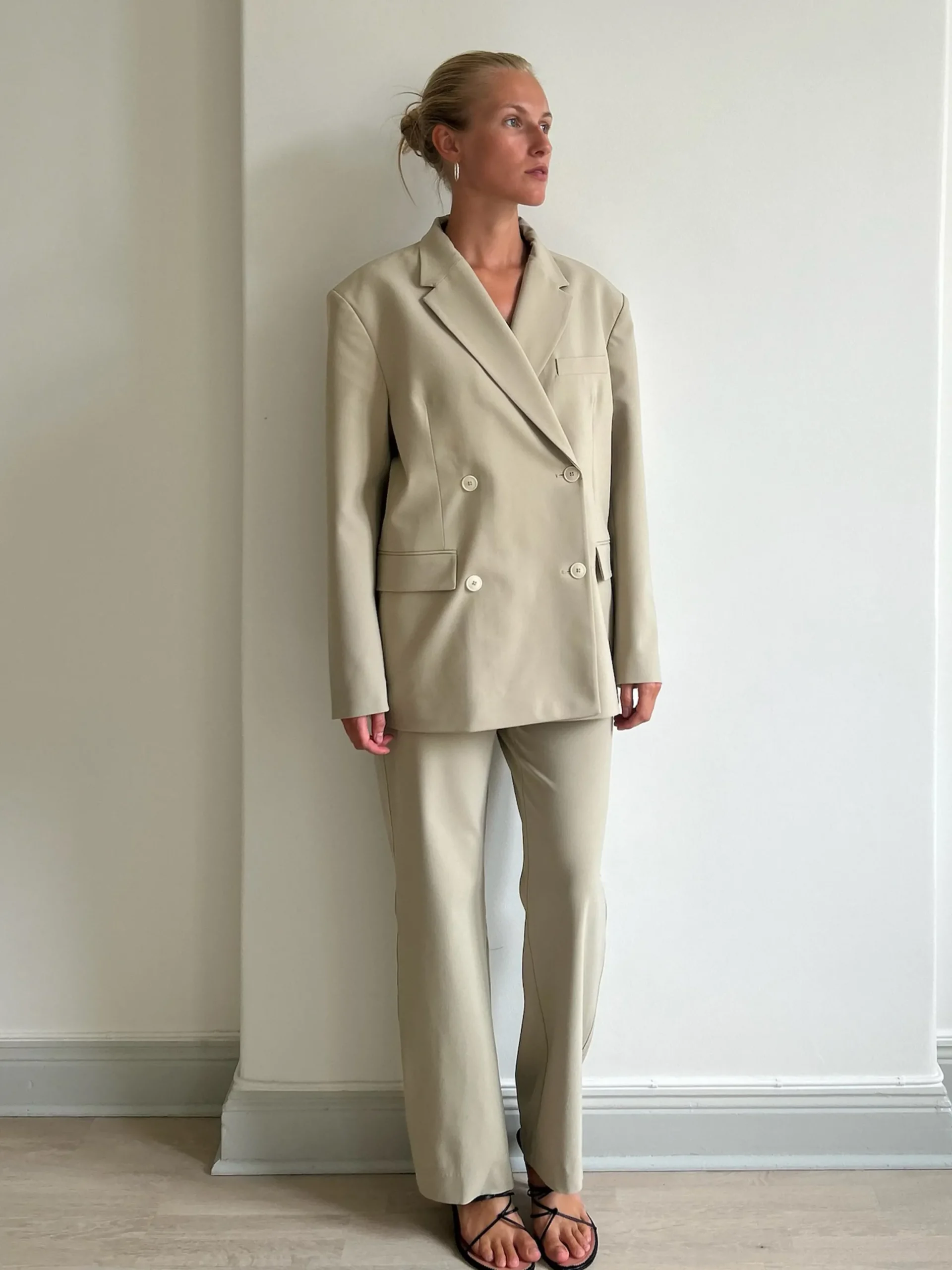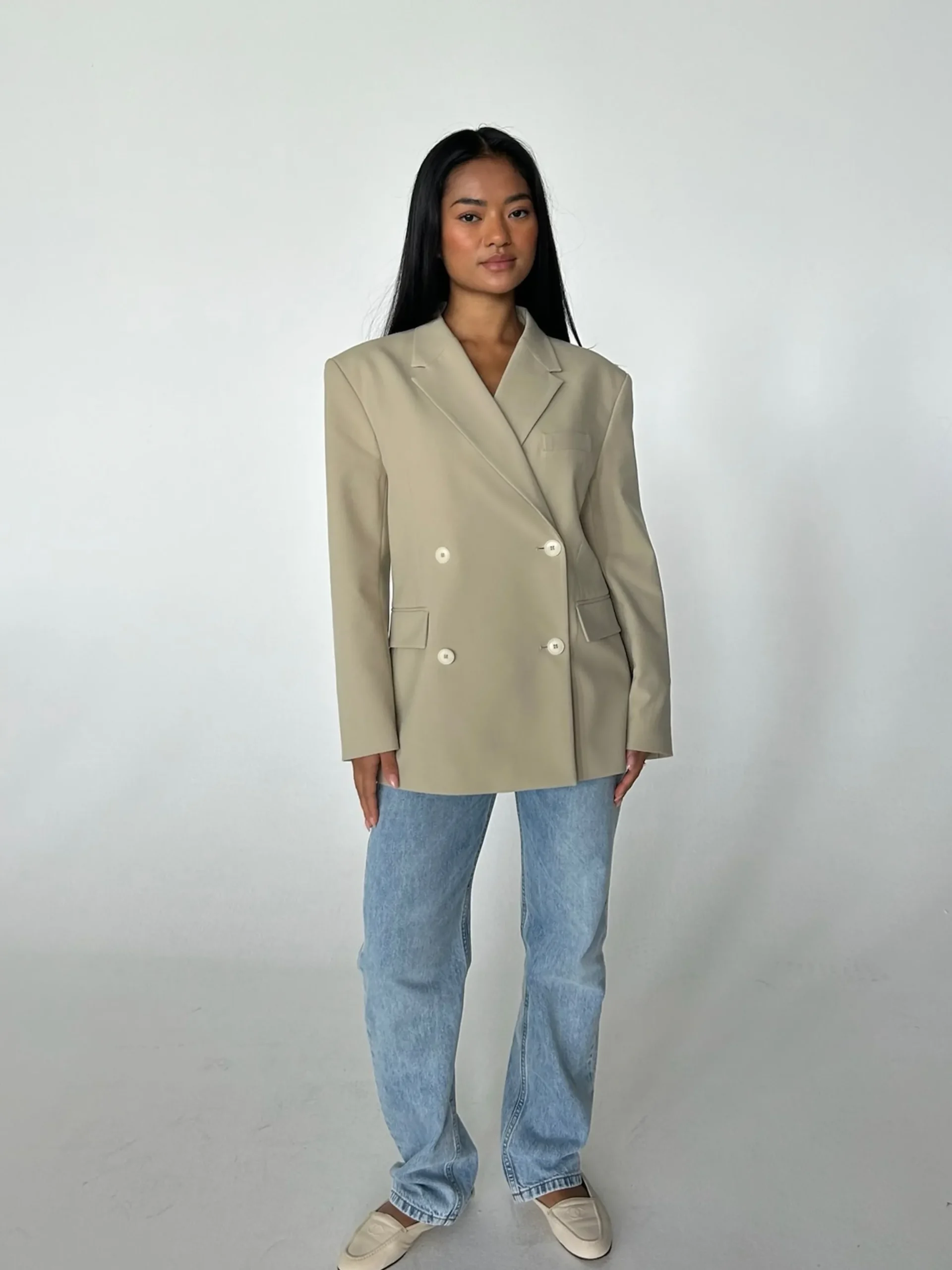 A statement piece blazer, designed to complete any casual or dressed up outfit. The oversized fit and the double sets of corozo buttons at the front gives this blazer a bold yet clean and minimalistic look. An essential in any wardrobe, beautiful to wear over a dress, with denim or as a full suit together with suit pants.