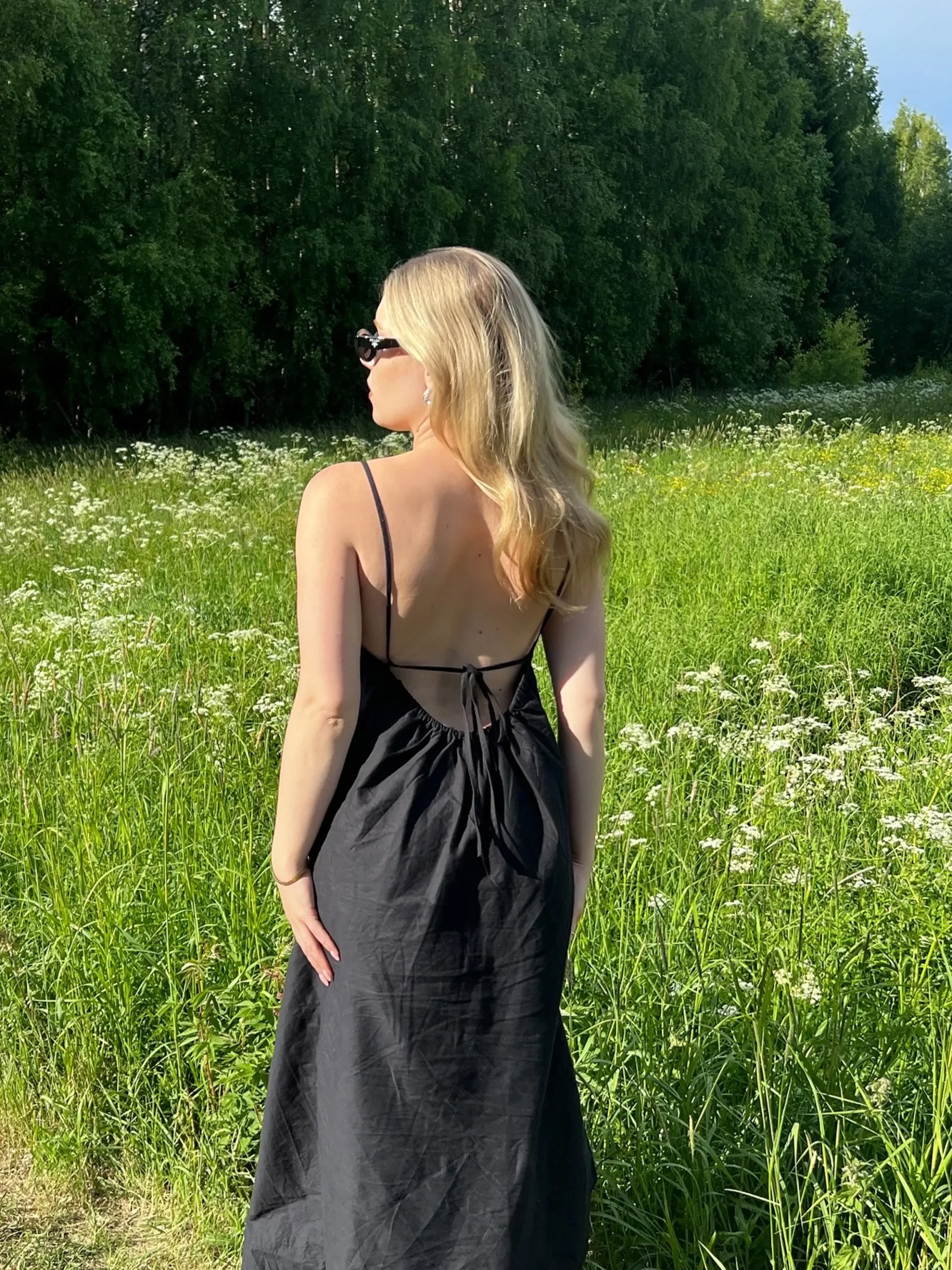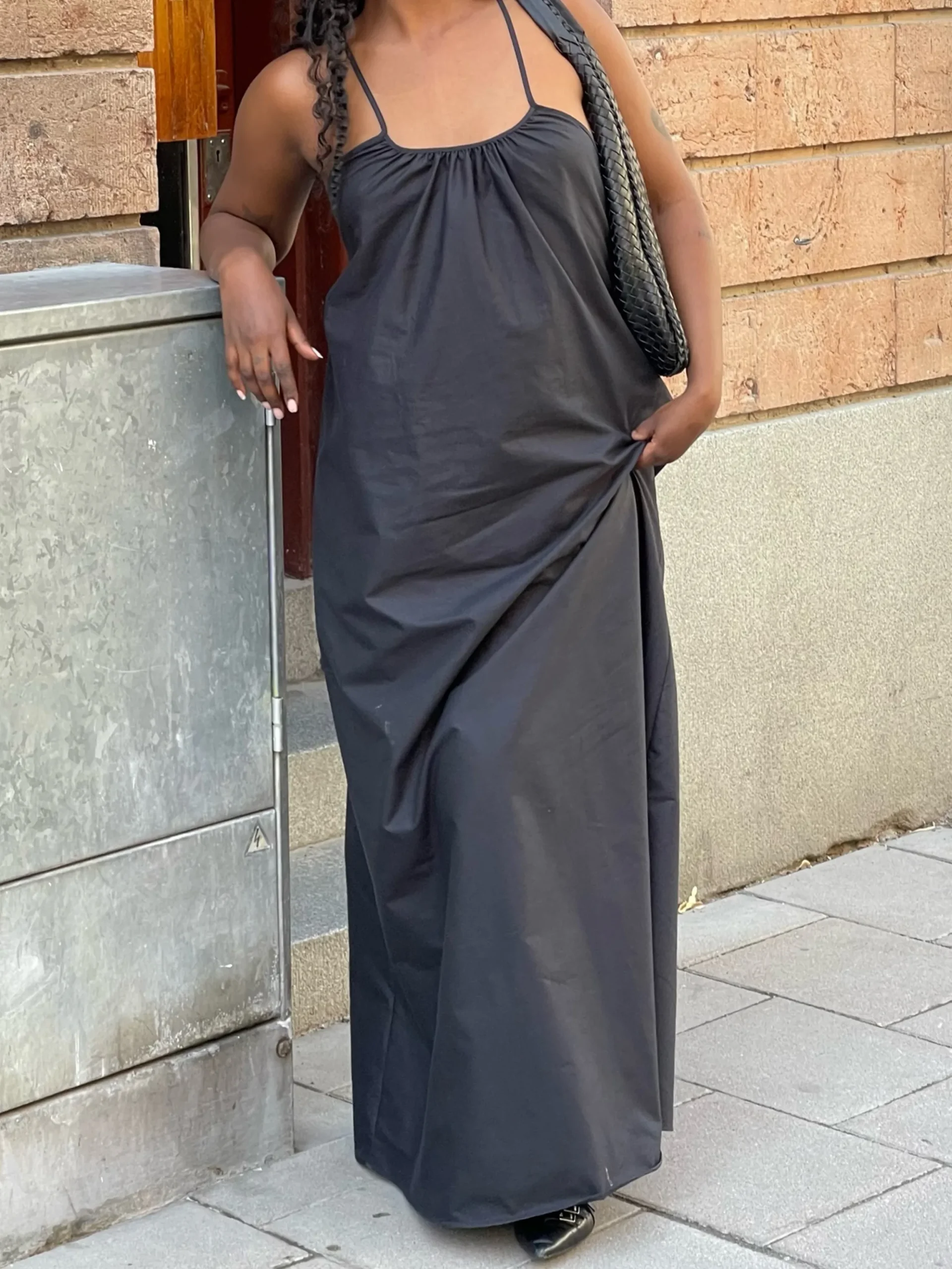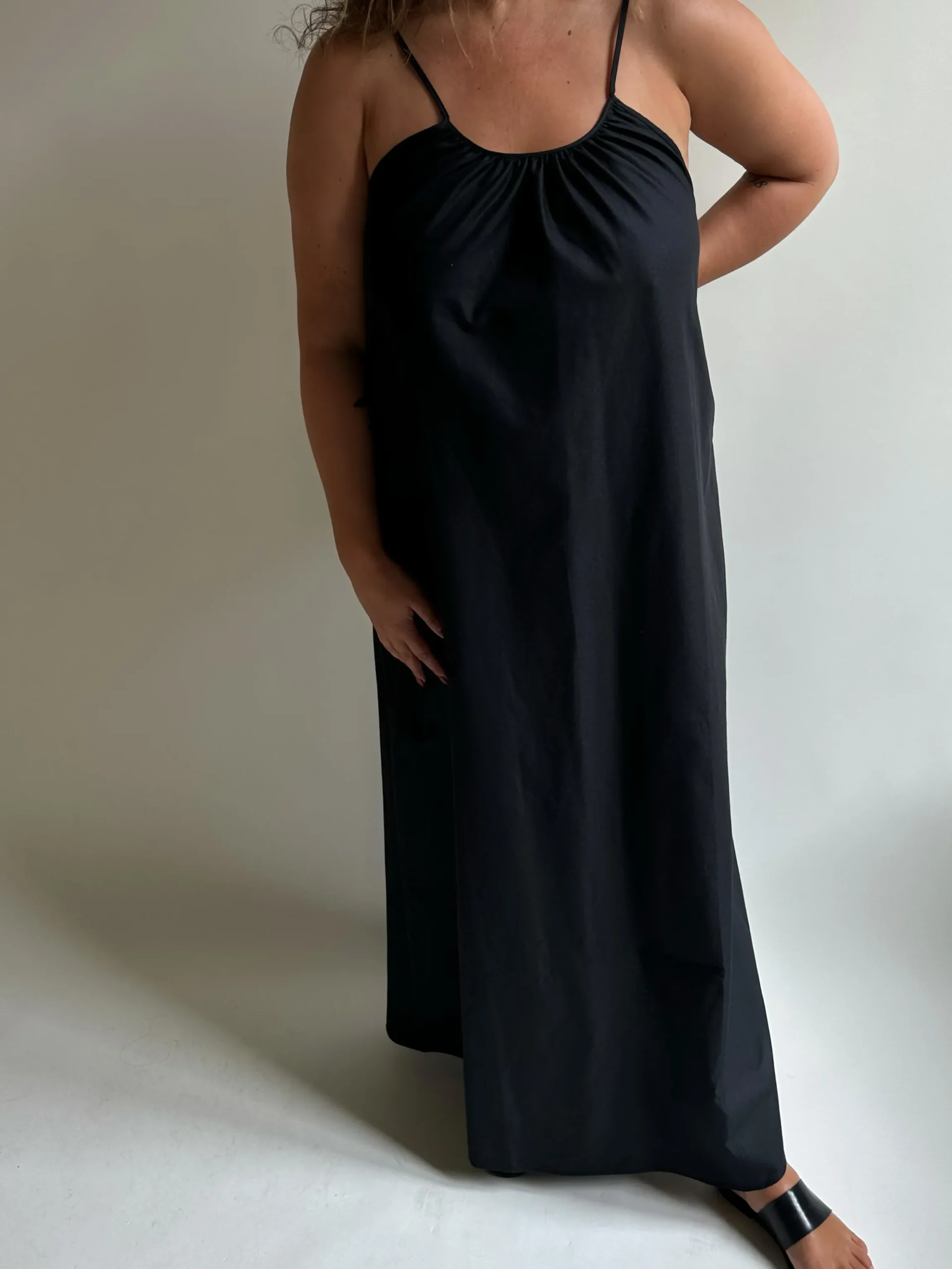 The Breezy Dress is a maxi dress made in our favorite Breezy oxford fabric in organic cotton which gives it a beautiful drape and volume. It has thin straps to adjust the length and the width, with a low cut back with elastic for comfort. Perfect to wear to the beach with swimwear underneath, for a day in the city with sandals, or at a party with a jacket over.