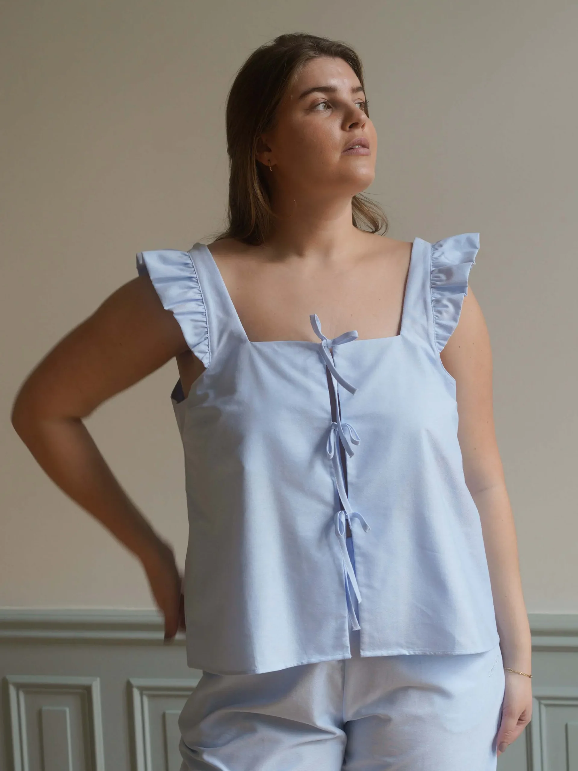 Made from the same GOTS certified organic cotton Oxford fabric as our Breezy Shirt and Pants, this delicate top is another addition to the Breezy family. The straps that ties in the front as well as the gathered details on the shoulders gives it a cute look while the classic woven fabric gives it a luxurious shape and silhouette. It is designed to fit loose and comfortably and we love to pair it either with our denims or together with the Breezy Ankle Pants for a complete Breezy look.