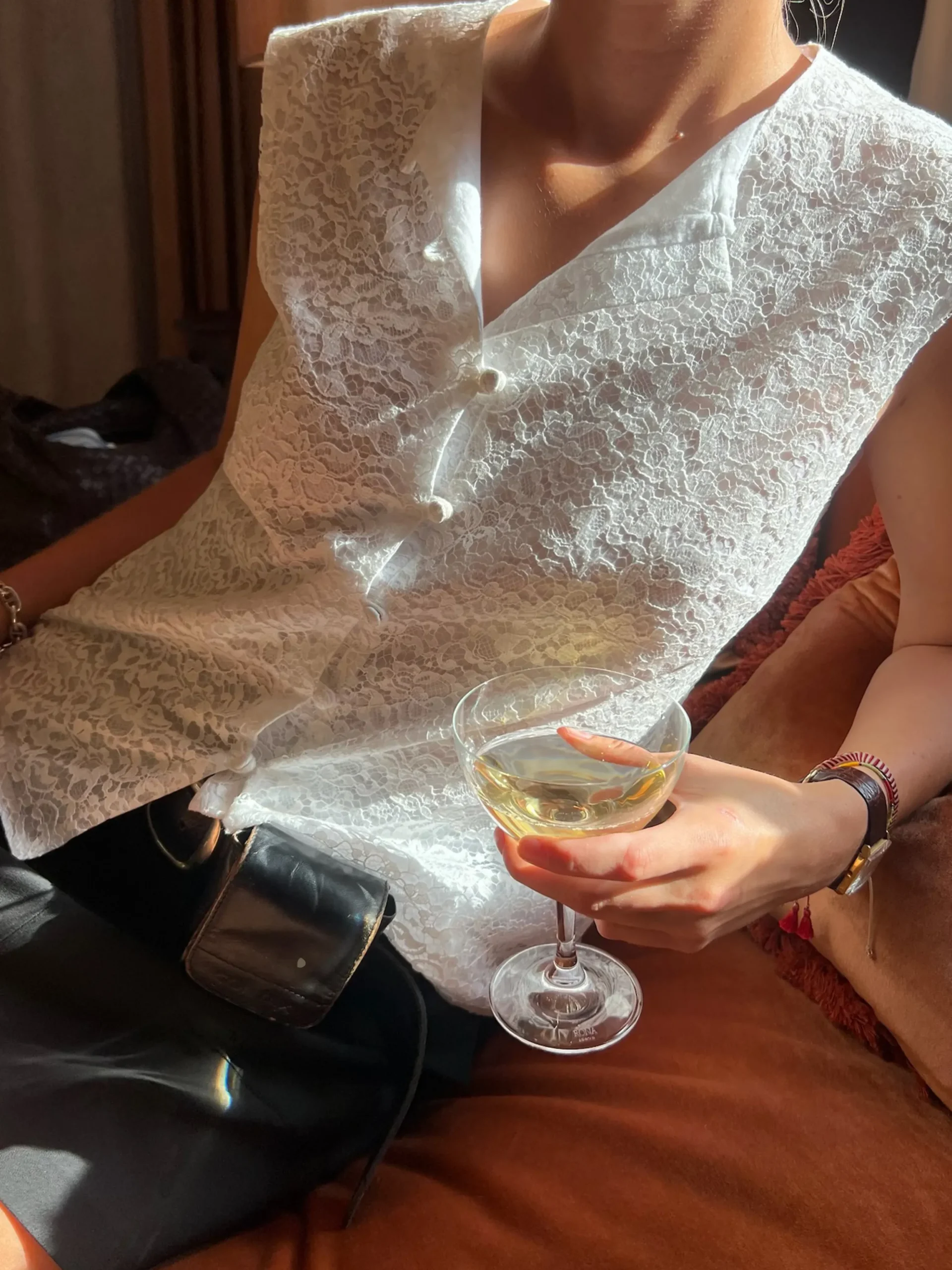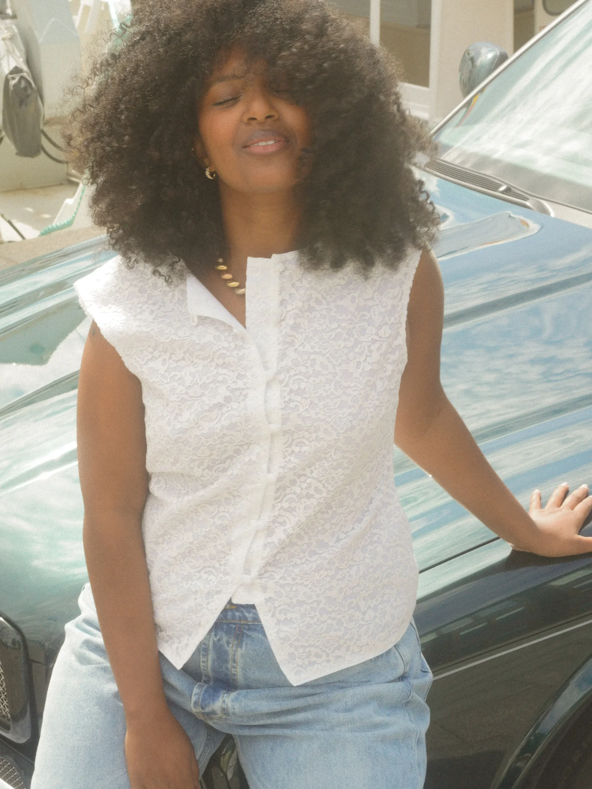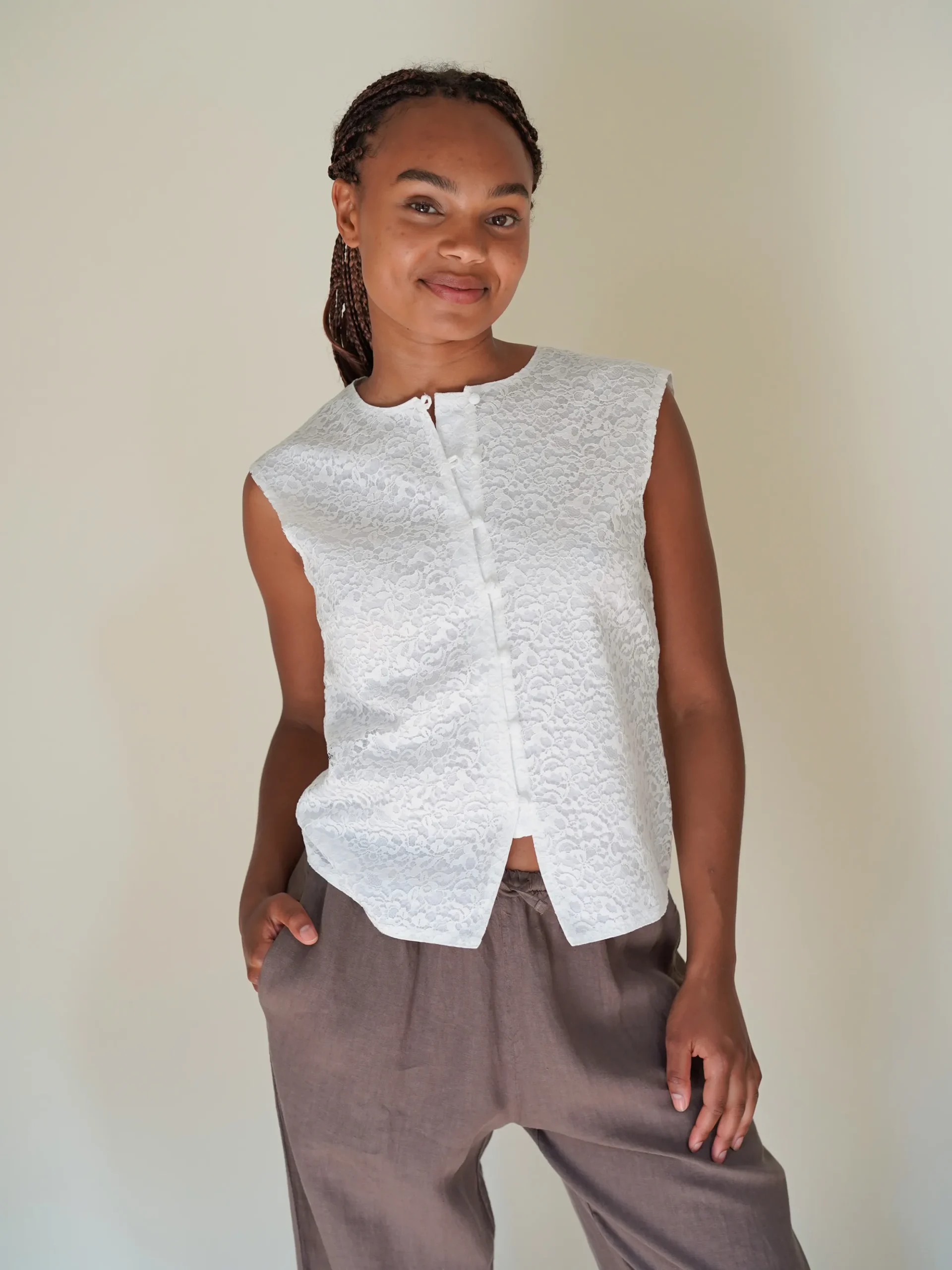 This gorgeous lace top is made with a deadstock lace fabric from Nona Source. The combination of the delicate lace and the classic vest design makes this top an elegant and luxurious choice for those special occasions. The top is beautiful to wear with the fabric covered wooden buttons buttoned all the way up or with a few buttons opened, and it can be paired with both skirts, suit pants or jeans.