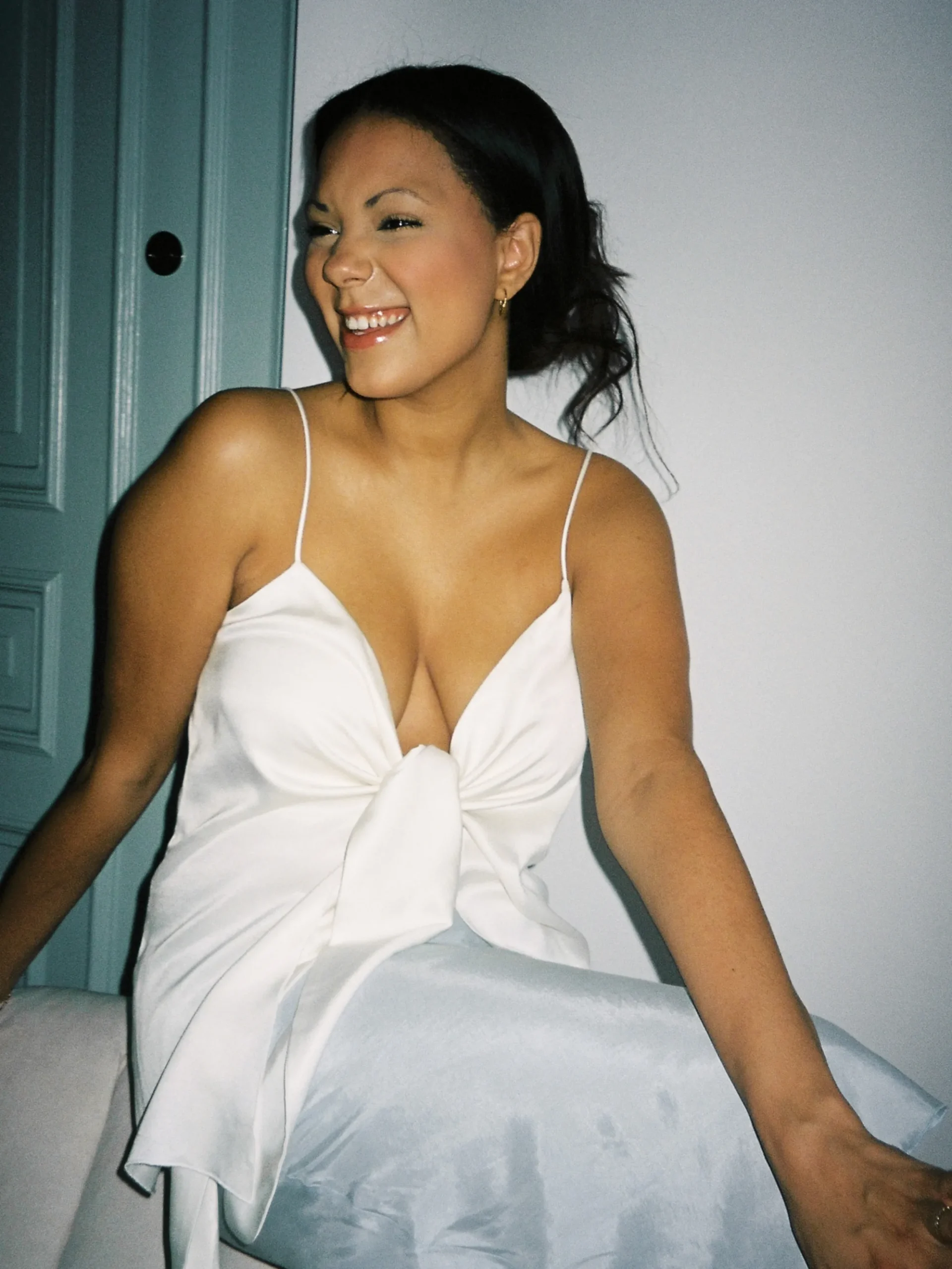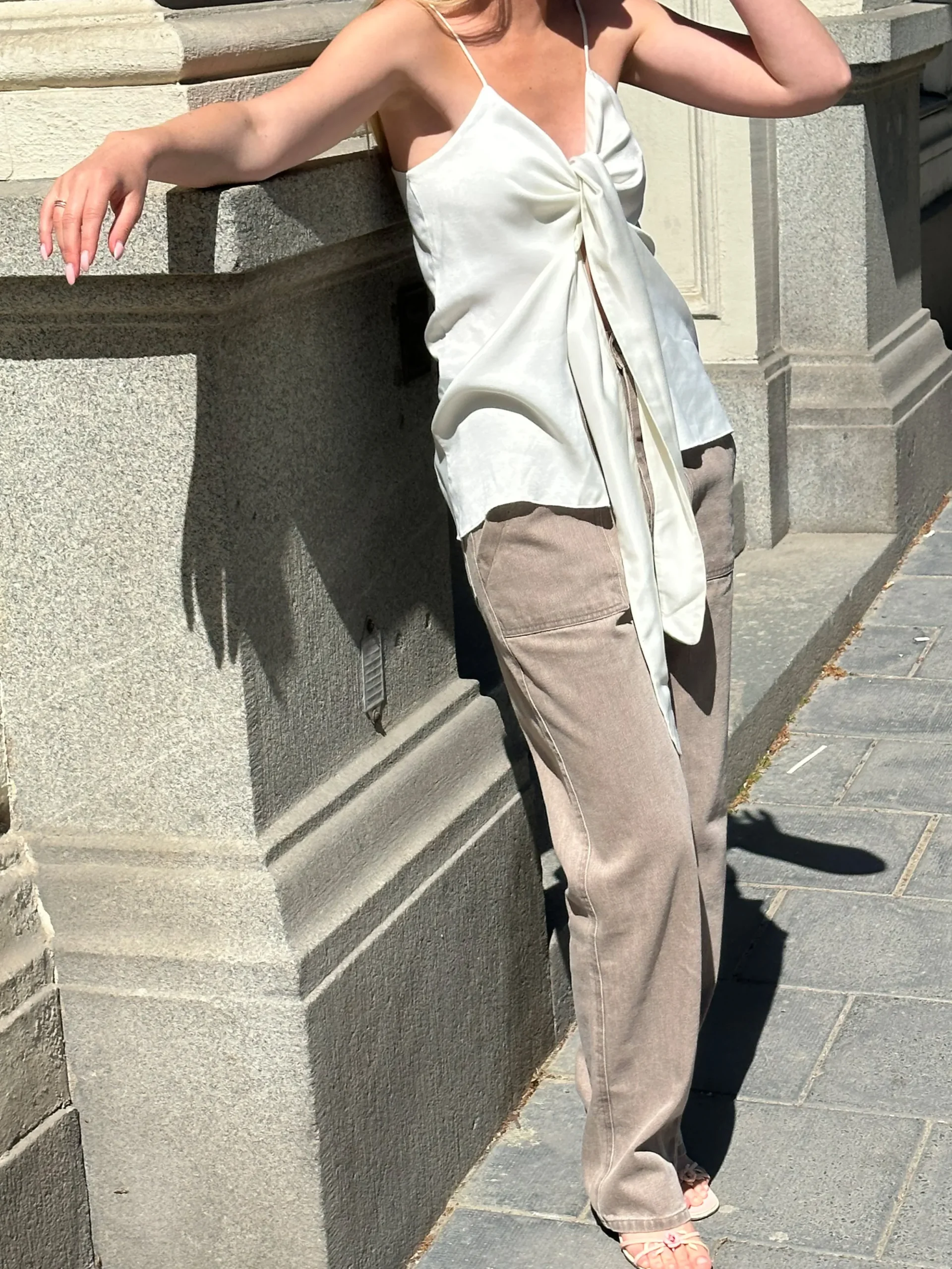 Our Tie Tank Top has spaghetti straps and a tie in the front. It’s made of our silky cupro fabric that has a peachy surface. The perfect top for any occasion.
