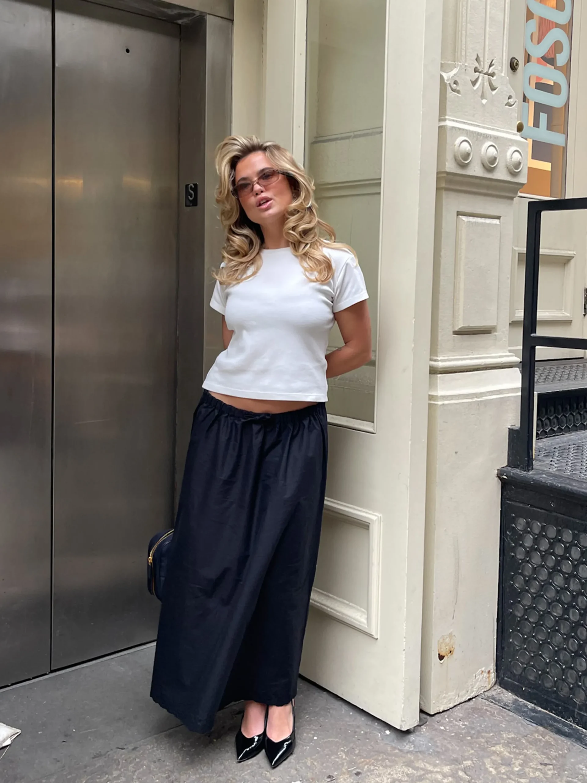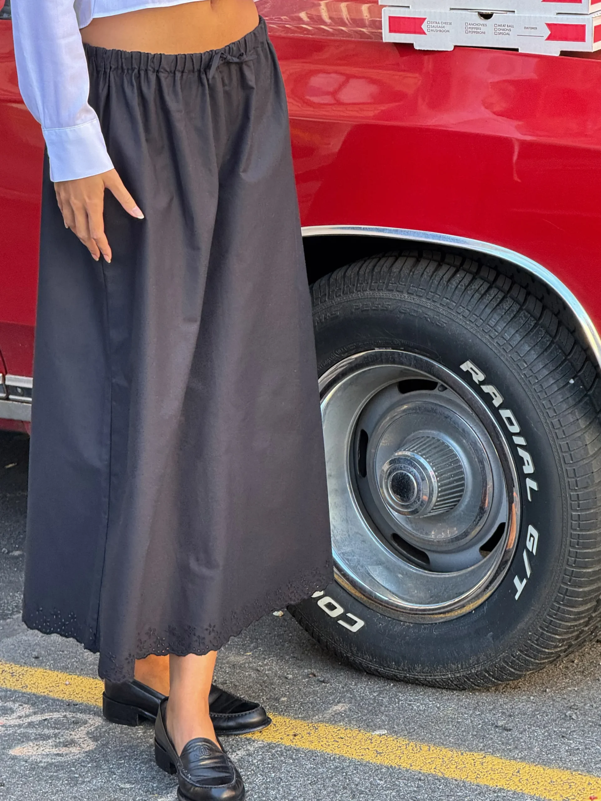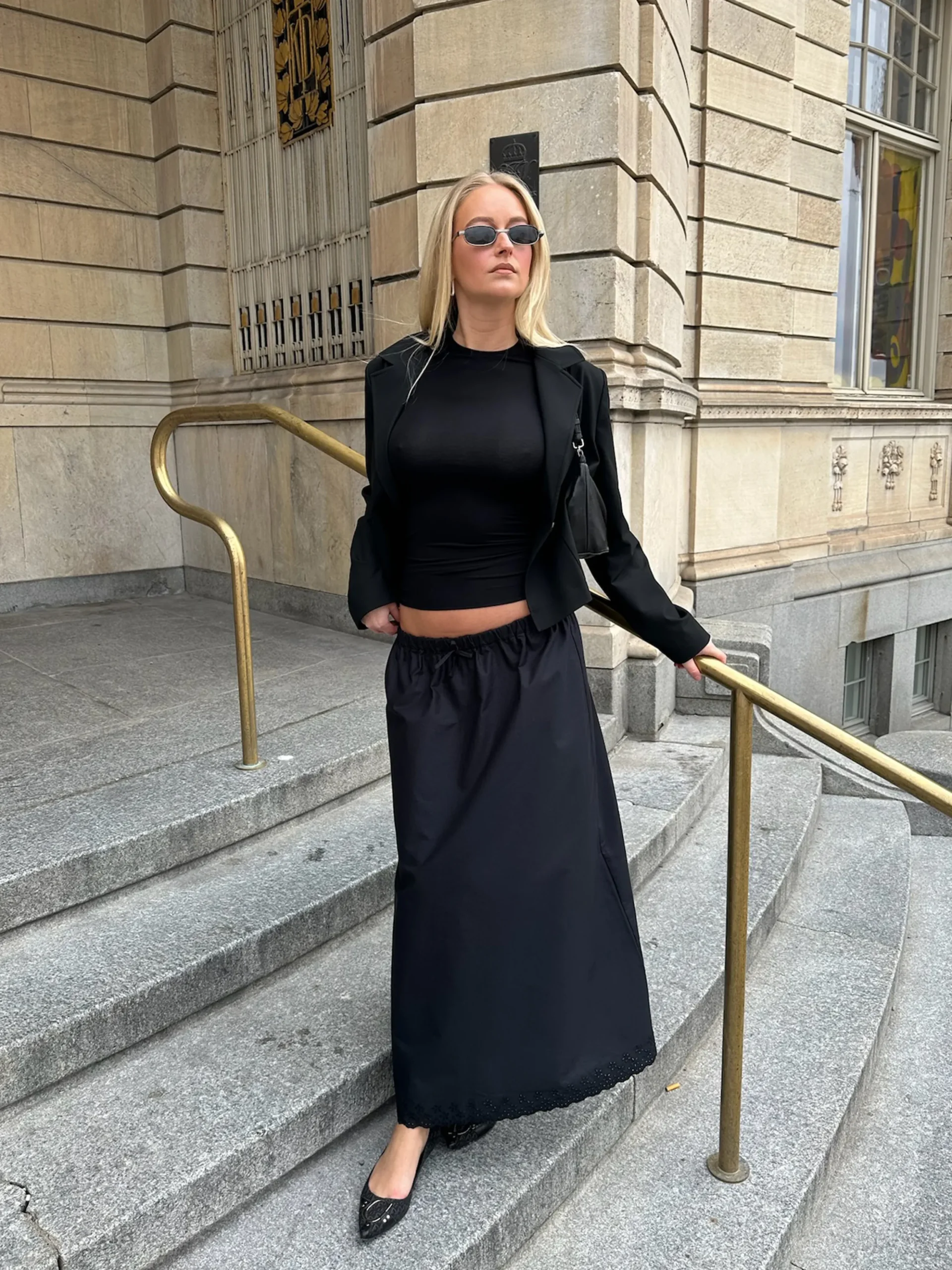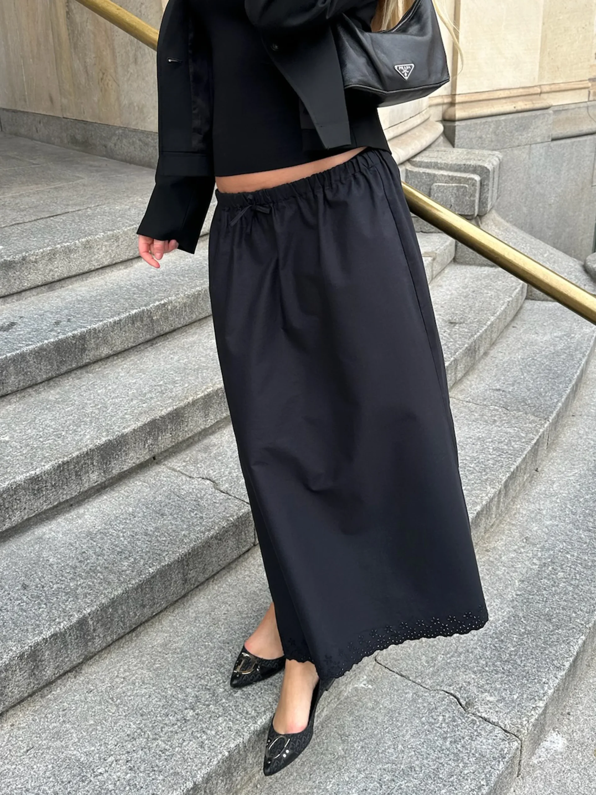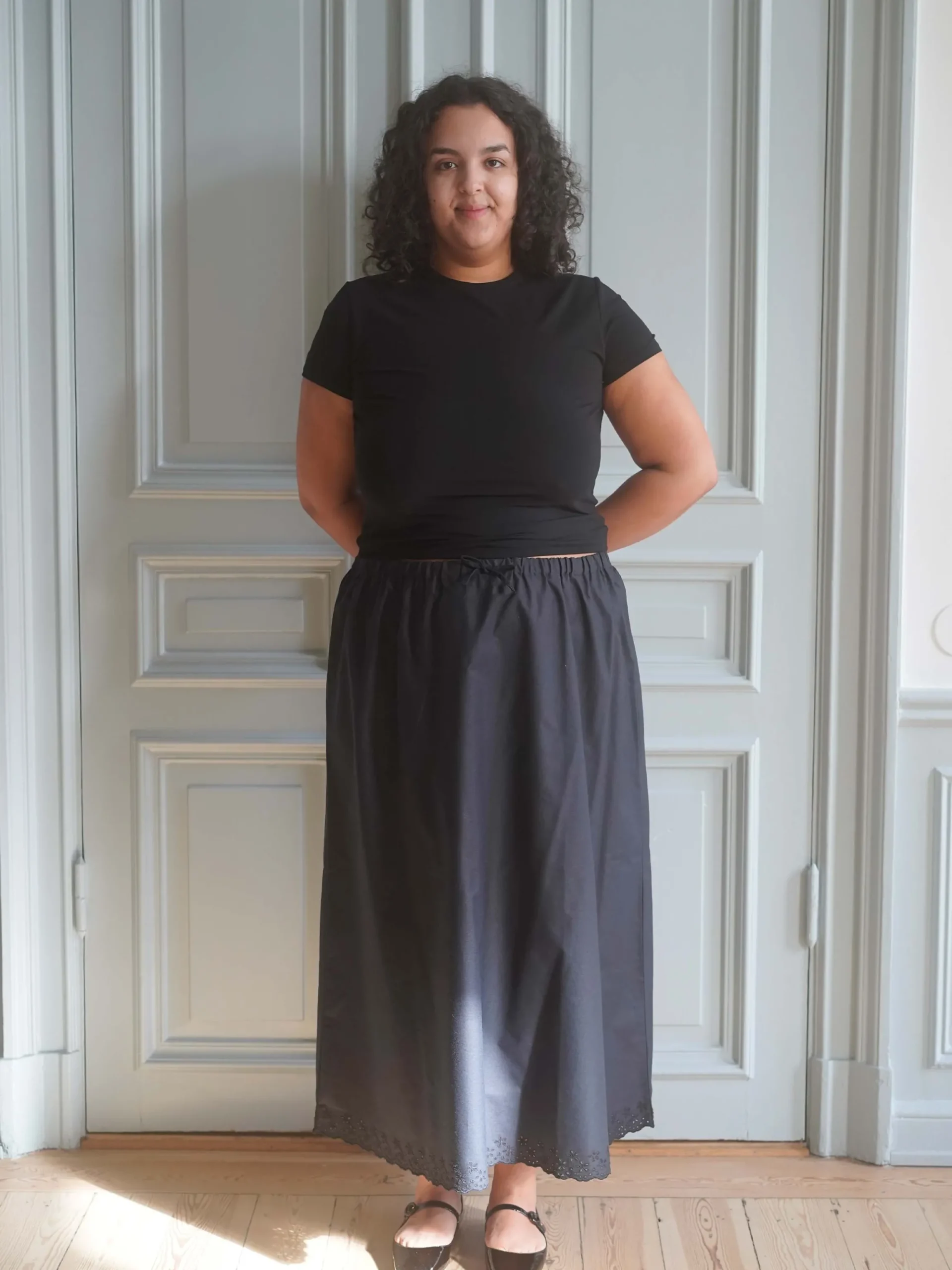 The Breezy Midi Skirt is a comfortable skirt with an embroidered edge at the bottom. Thanks to the elastic waistband it can be worn at different positions in the waist, and it is easy to style and wear in different ways. We love to wear it together with Breezy Shirts, Daily Tank Tops or a knitted Crewneck Sweater.