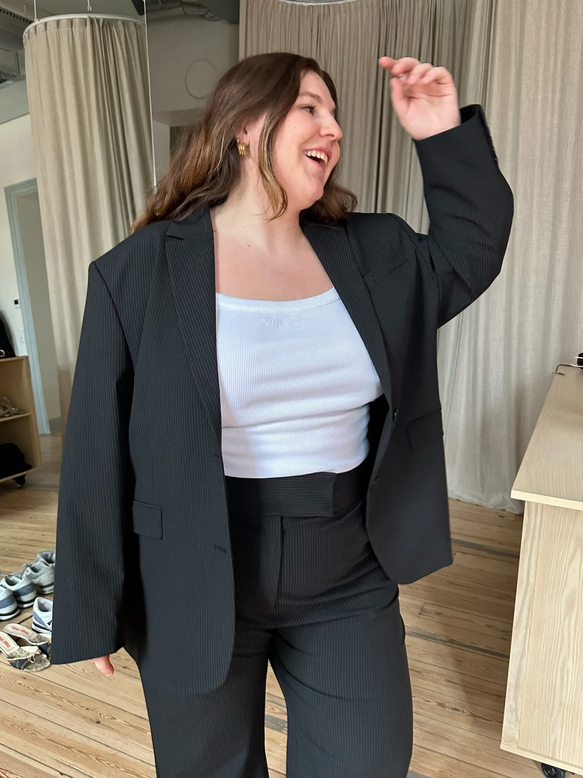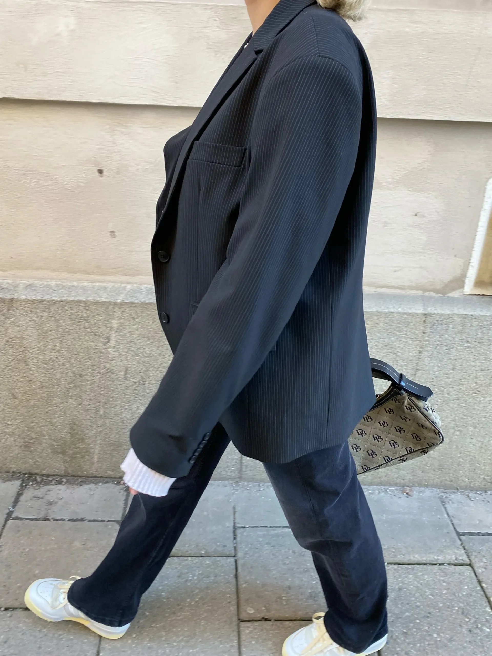 Our Forever Blazer Pinstripe is made from deadstock fabric. It’s timeless, classic and oversized, and can be matched with every item in your wardrobe.
