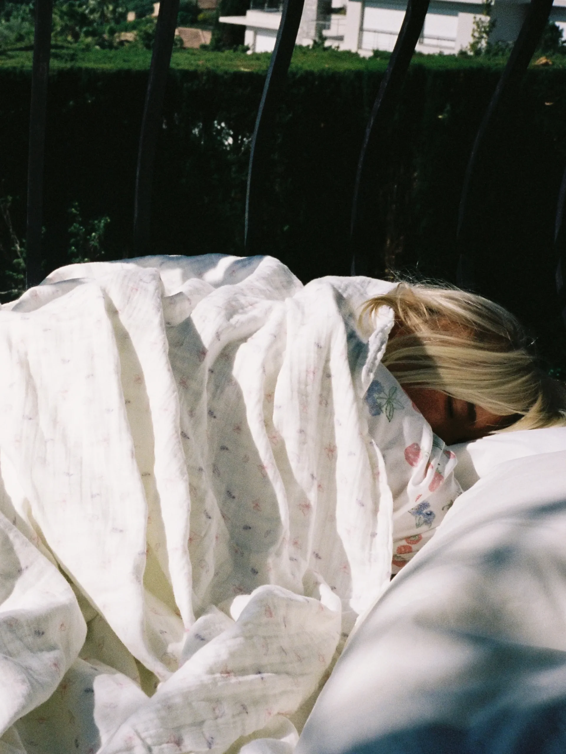 This bedding is made out of the softest muslin cotton fabric that we could possibly find! Our unique print together with the luxurious quality of organic cotton fabric, makes us want to never get out of bed. The duvet covers have corozo buttons at the bottom for both closure and to keep the duvet in place, while the pillow cases have an inside pocket to keep the pillow in place. The duvet covers has one side in a solid color and the other with a pattern.