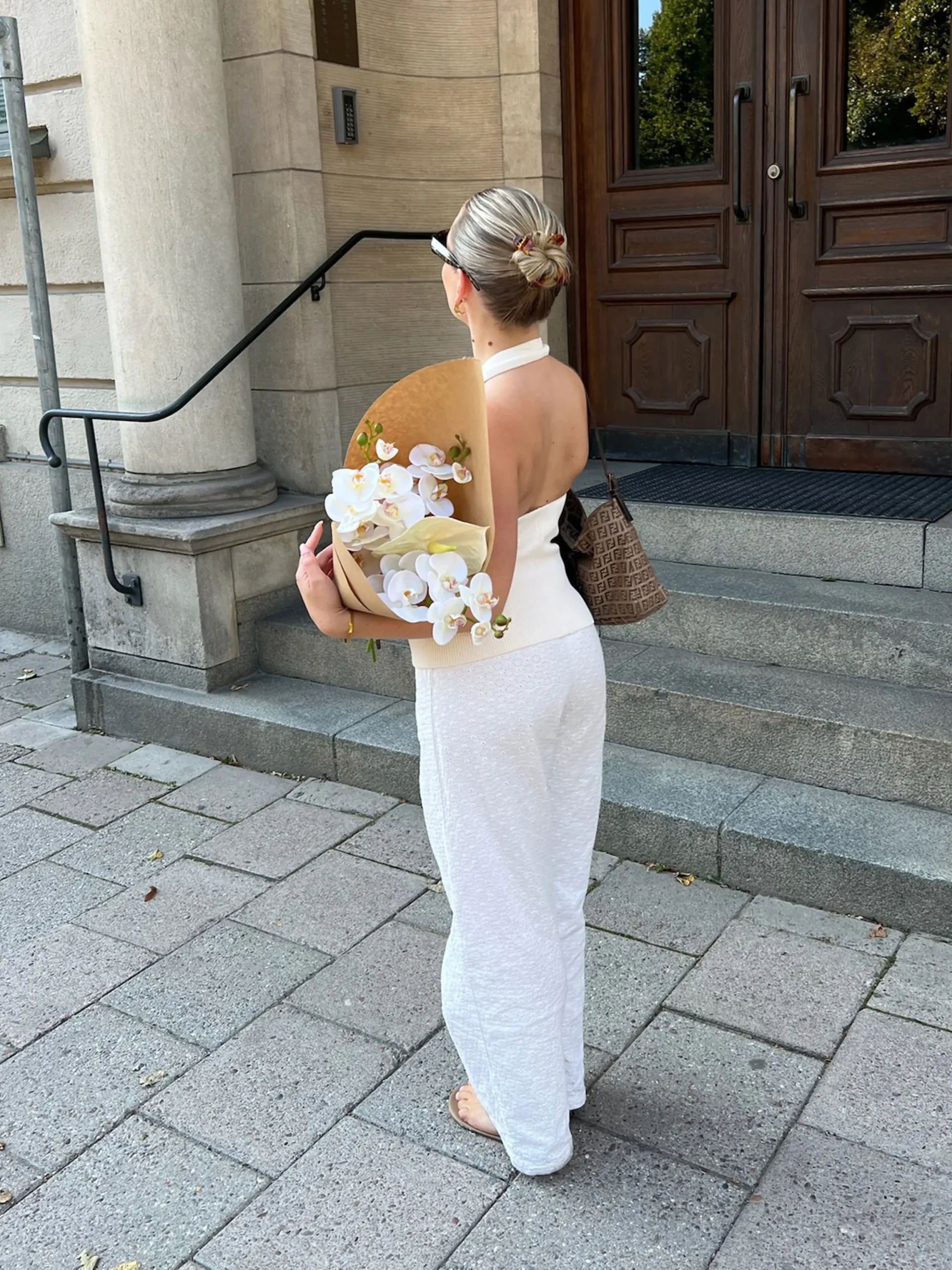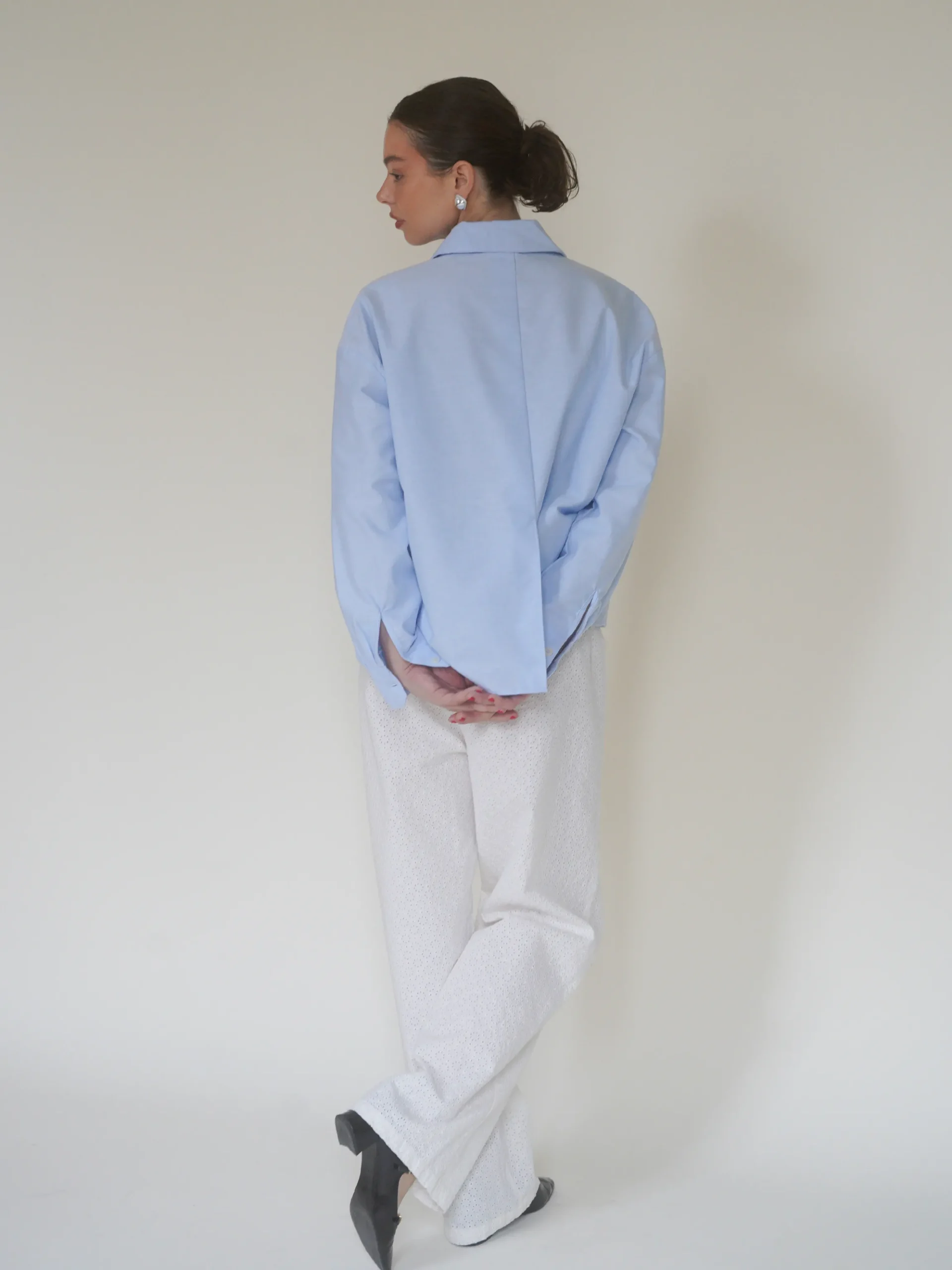 One of Matilda's favorite pair of pants for the summer! The Broderie Pants are a loose fitted pair of pants with an all-over embroidered print, called Broderie Anglaise. They have a drawstring waist that can be worn either low- or mid waisted.