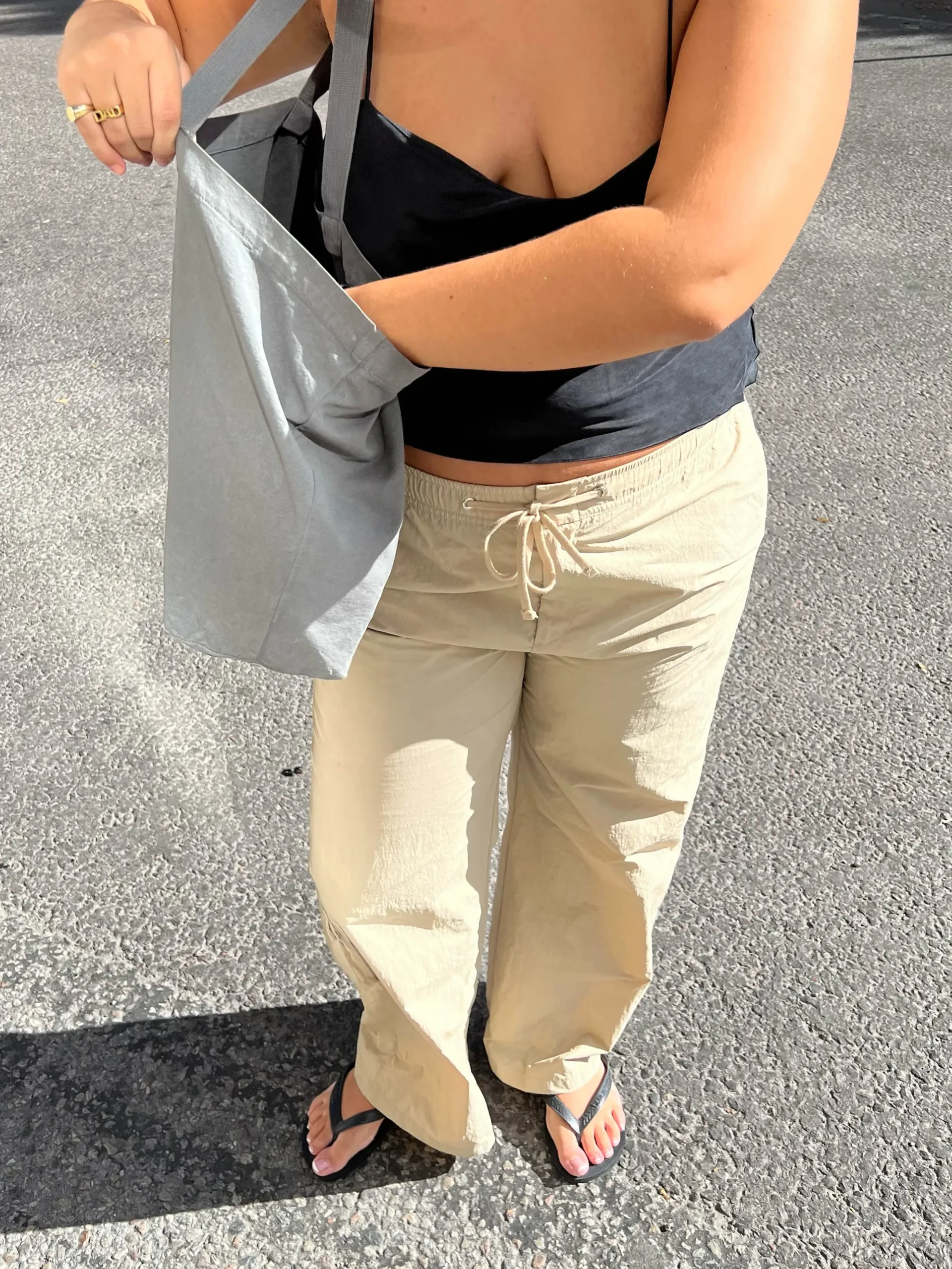 Our Sporty Pants are a loose fitted pair of pants that are perfect when you want a relaxed and comfortable look. They have an elastic waist with a drawstring, button and zipper at the front, side pockets, a Djerf Avenue logo label at the left side seam and a decorative back pocket on the left side. Wear them with your favorite wardrobe essentials!
